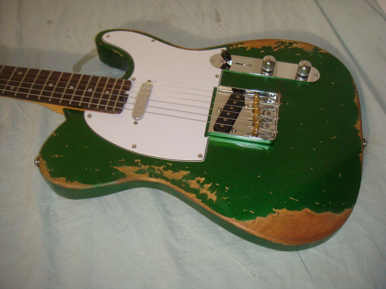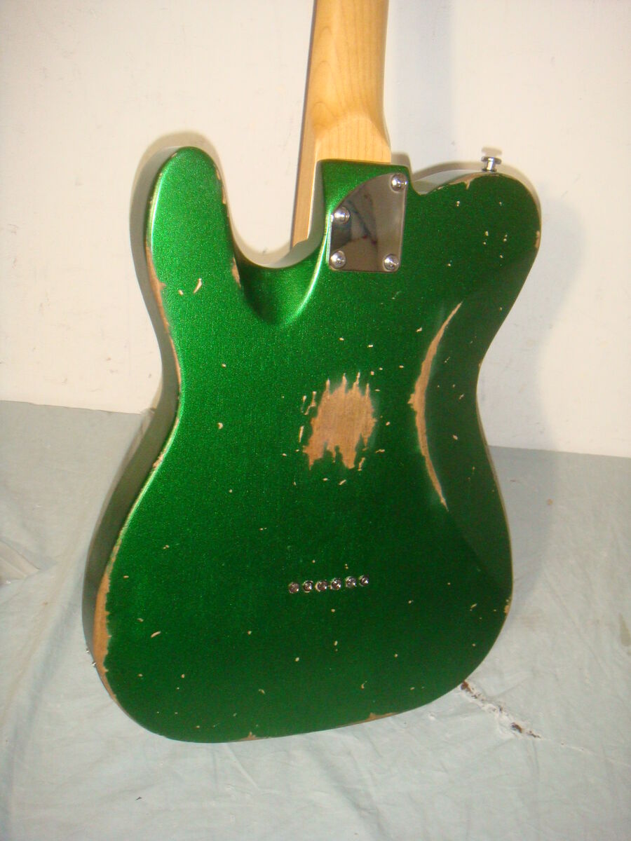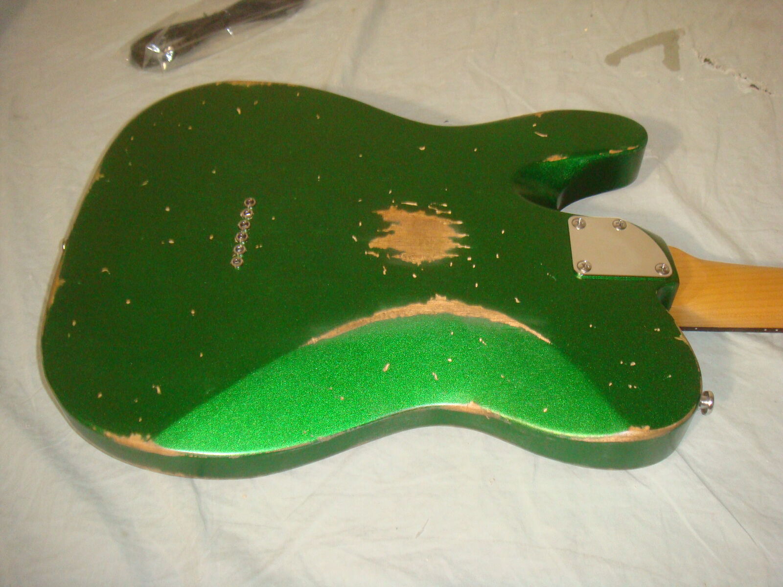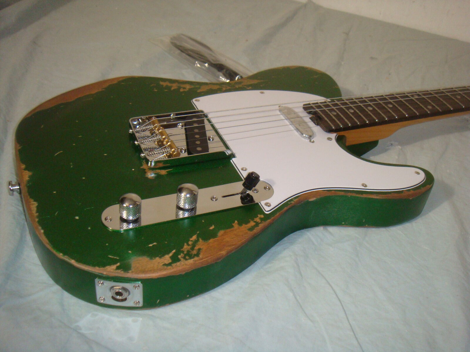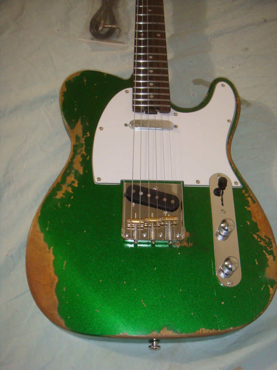 KGD RELIC T GREEN METALLIC TELECASTER ELECTRIC GUITAR W AGED/VINTAGE FINISH. This is a brand new guitar that was only opened for the photos. This is a super cool pre-distressed/aged guitar made to look like a Road Worn Tele, who's prices are WAY more money! It comes with everything shown. This is your chance to save big-time so don't miss out!!