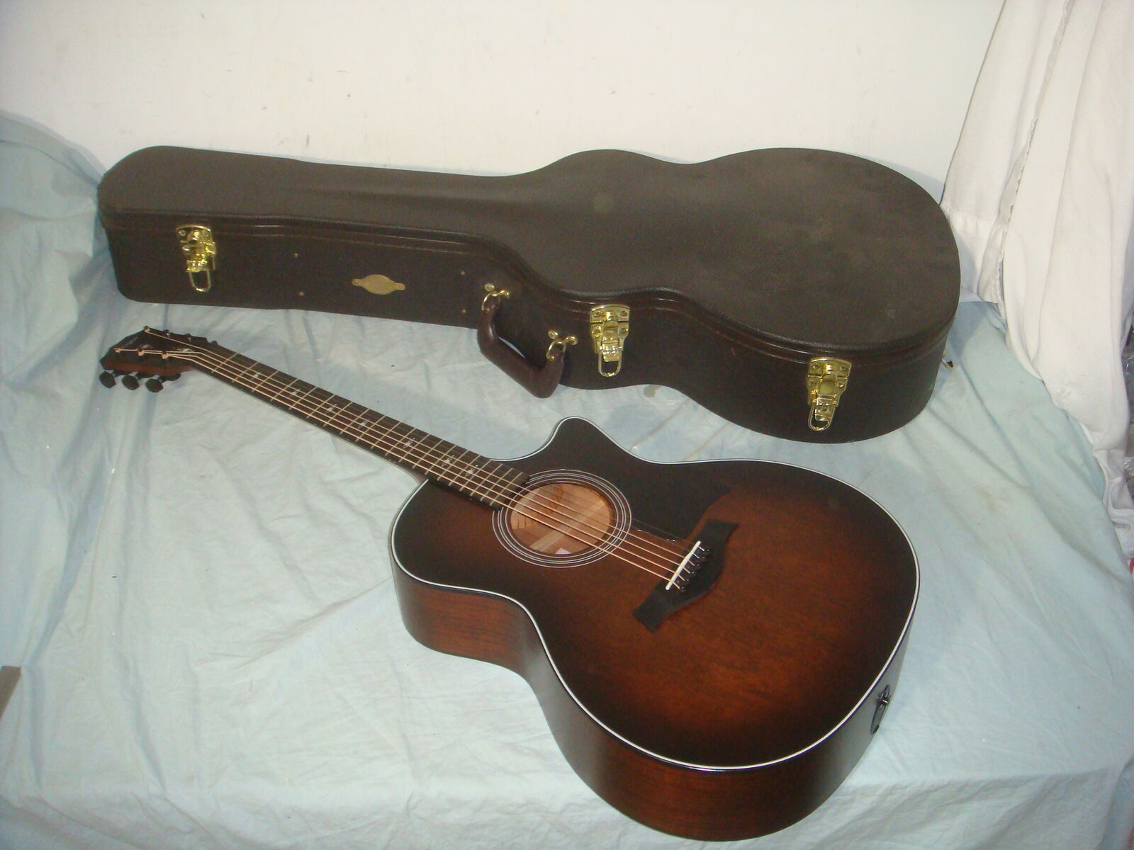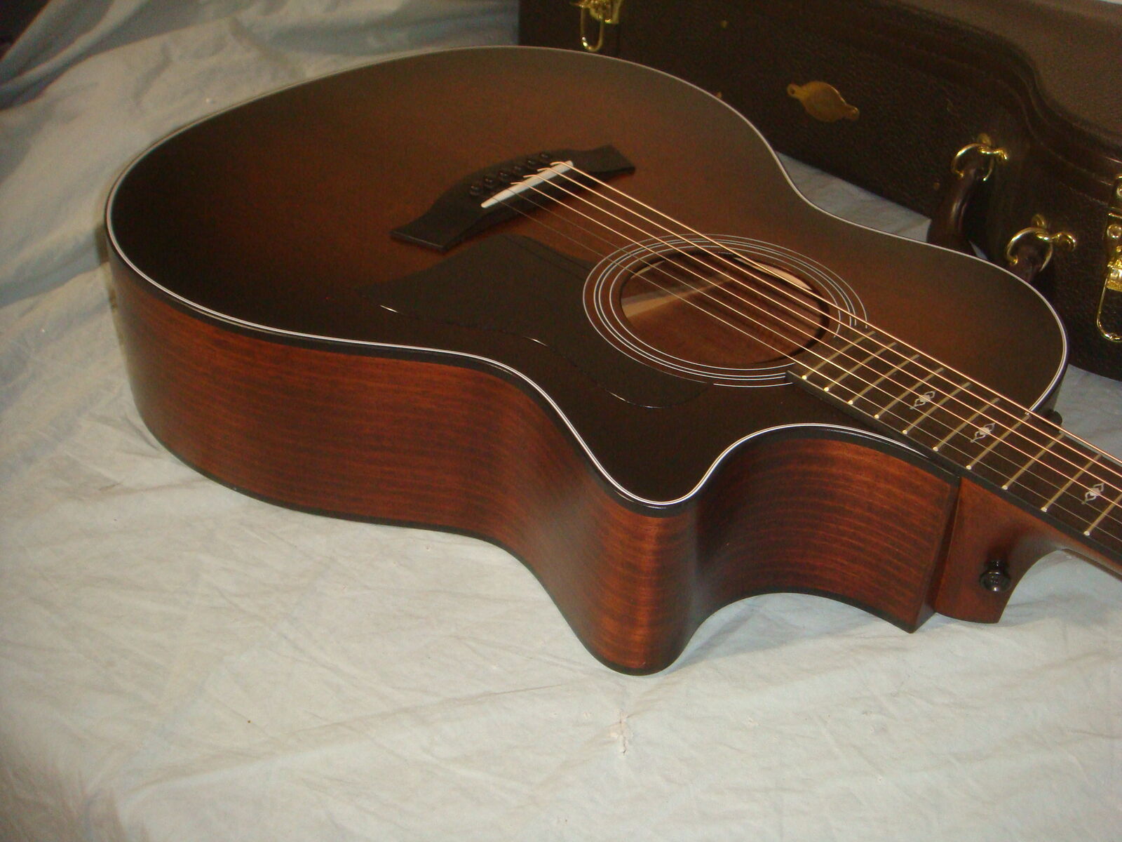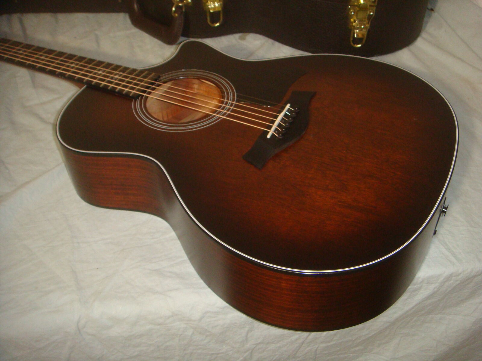 TAYLOR 324CE TROPICAL MAHOGANY GRAND AUDITORIUM ACOUSTIC-ELECTRIC GUITAR IN A SHADED TOBACCO EDGEBURST FINISH WITH HARD CASE. This is a practically new guitar that is in excellent condition! It has hardly a mark on it and looks and plays beautifully! The case has a couple of super minor dings and marks on it, and some very minor bending on one latch lever, but the latch still works without issues, and otherwise this thing is pristine! It comes with everything shown. These are normally $2700. This is your chance to save big-time so don't miss out!!