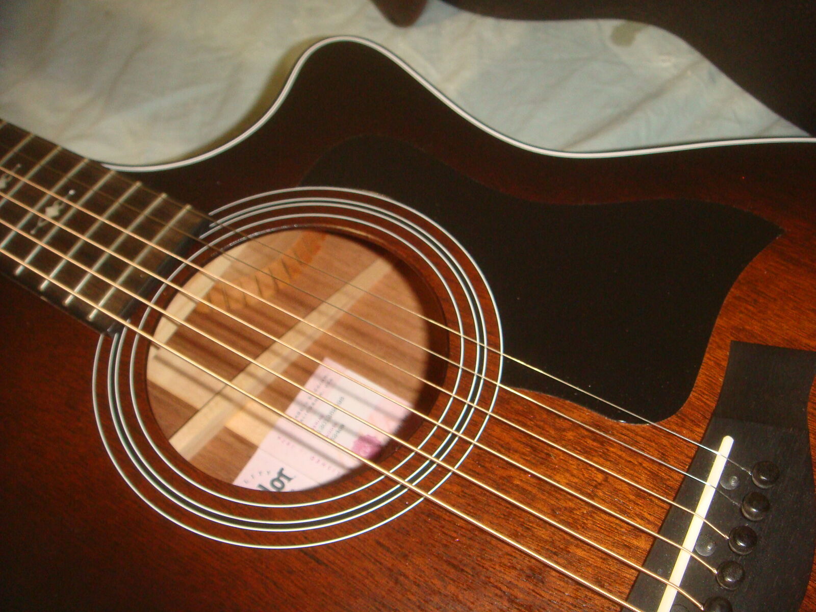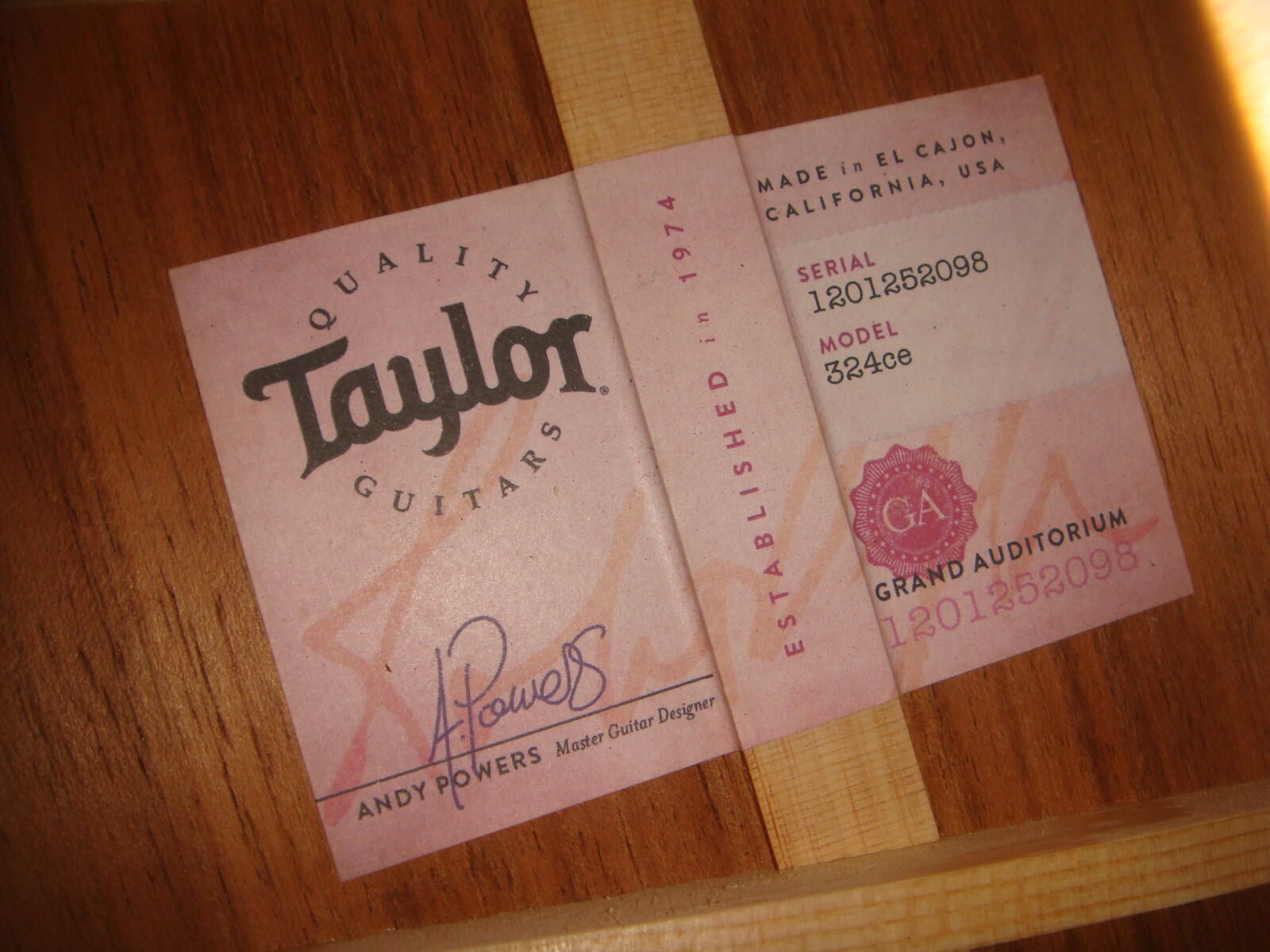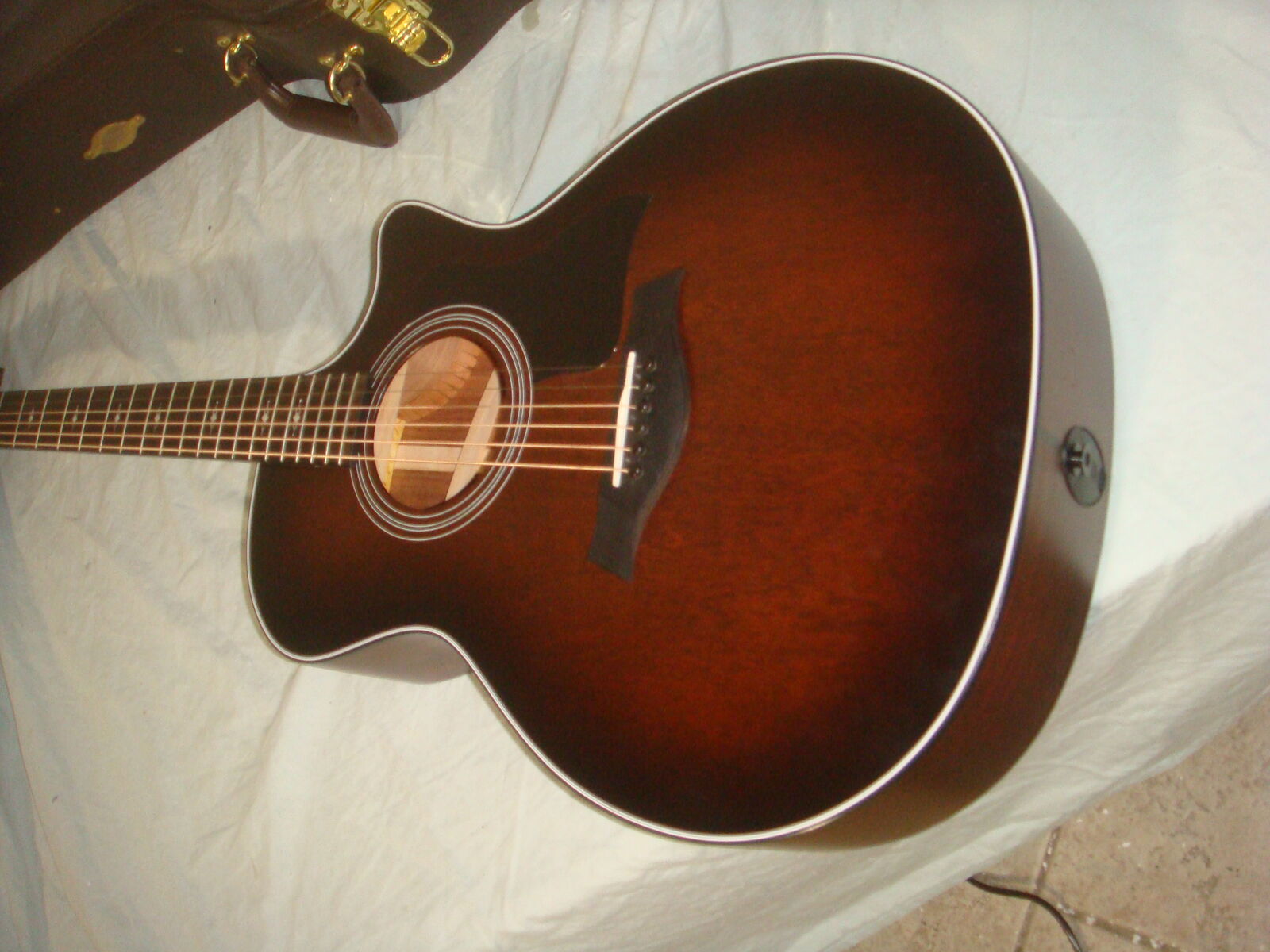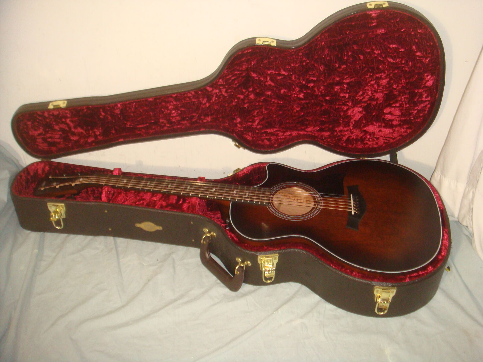 TAYLOR 324CE TROPICAL MAHOGANY GRAND AUDITORIUM ACOUSTIC-ELECTRIC GUITAR IN A SHADED TOBACCO EDGEBURST FINISH WITH HARD CASE. This is a practically new guitar that is in excellent condition! It has hardly a mark on it and looks and plays beautifully! The case has a couple of super minor dings and marks on it, and some very minor bending on one latch lever, but the latch still works without issues, and otherwise this thing is pristine! It comes with everything shown. These are normally $2700. This is your chance to save big-time so don't miss out!!