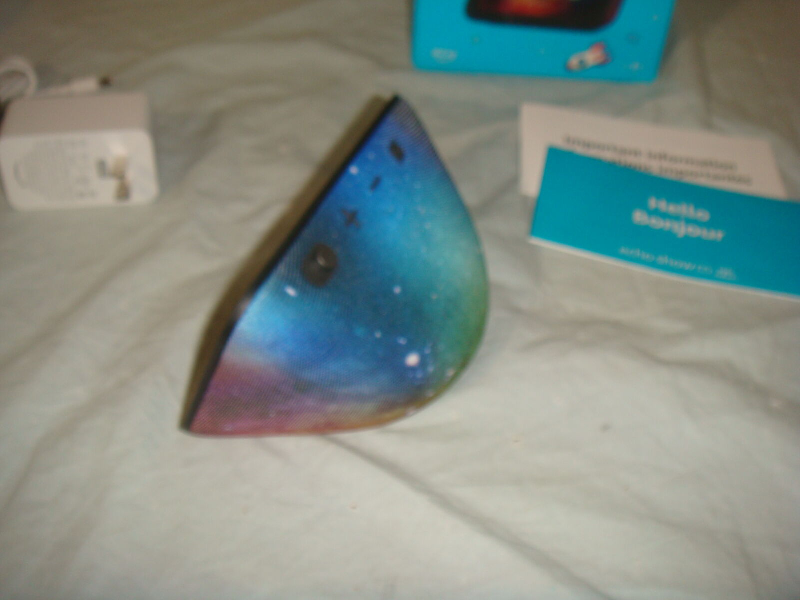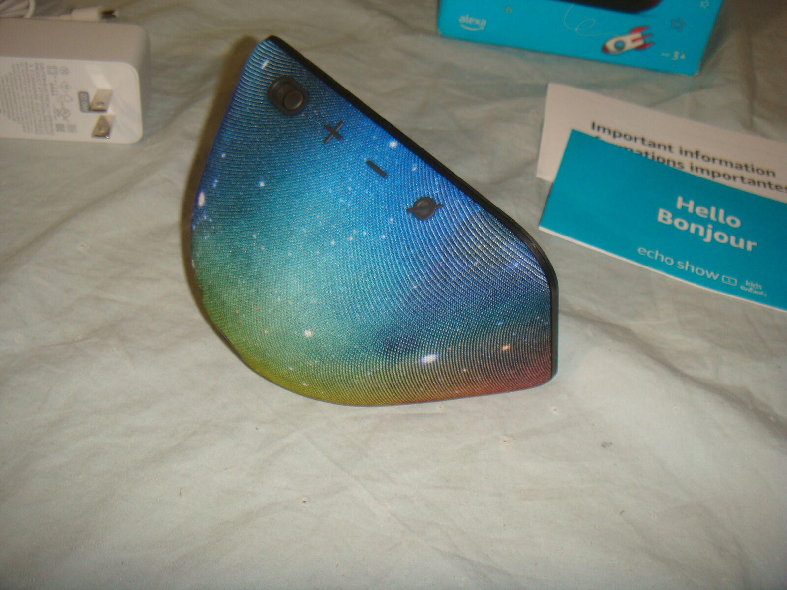 AMAZON ECHO SHOW 5 KIDS EDITION SMART DISPLAY SPEAKER IN SPACE GALAXY FINISH. This is a used unit that's in great overall condition. It comes with everything shown. This is your chance to save big-time so don't miss out!!