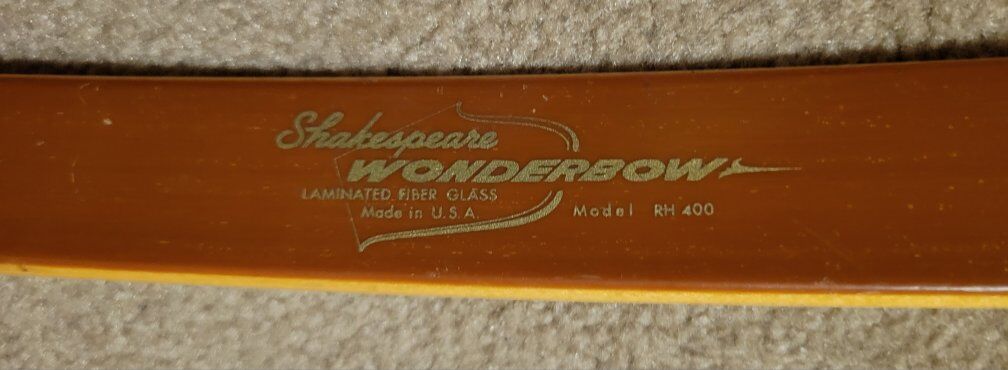 Shakespeare Wonderbow model RH-400. 45# 64 inch right hand recurve bow in great condition. Includes quiver, arrows, leather arm guard, and bow stringer. Made in the 60s.
