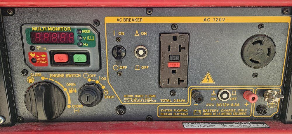 -2,800 Watt continuous / 3,200 Watt peak power. -Pull start or electric start (needs a new battery for electric start) -2.9 gal fuel tank -372 Hours -Cover and owners manual included