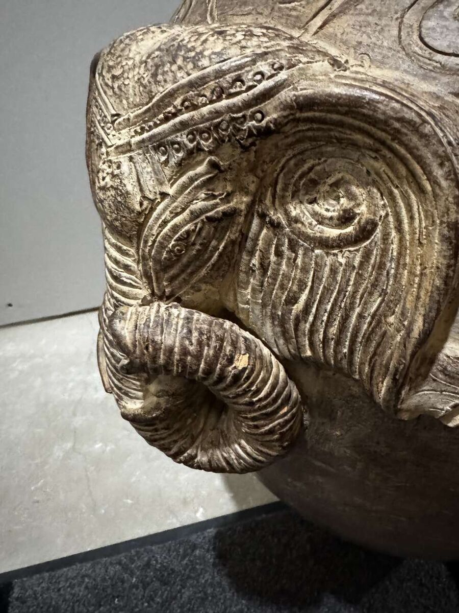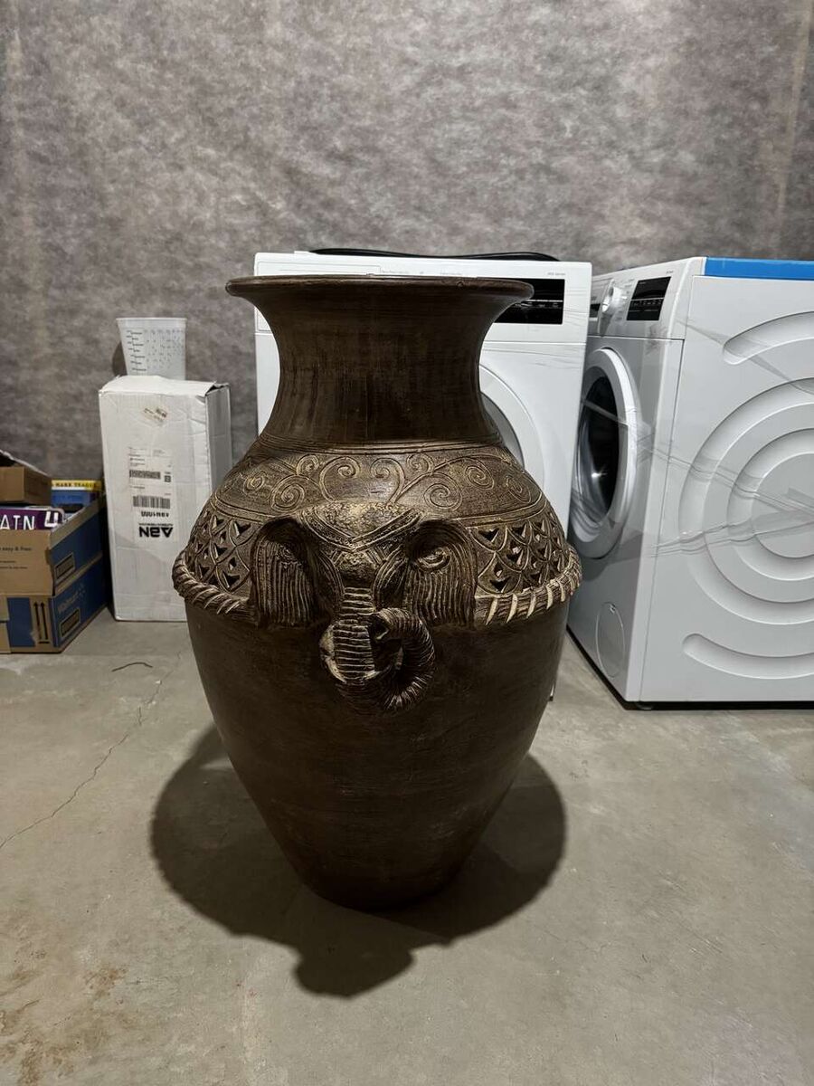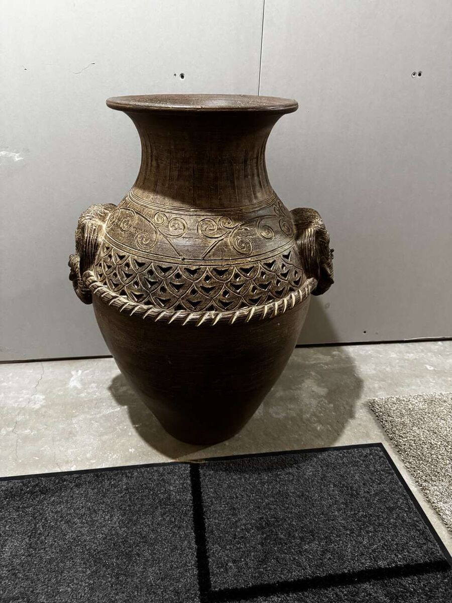 Antique Pier 1 Imports Large Terra Cotta Floor Vase with elephant motif.