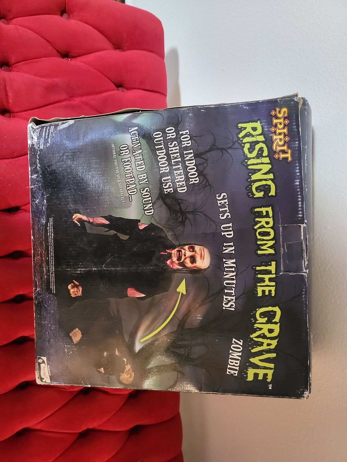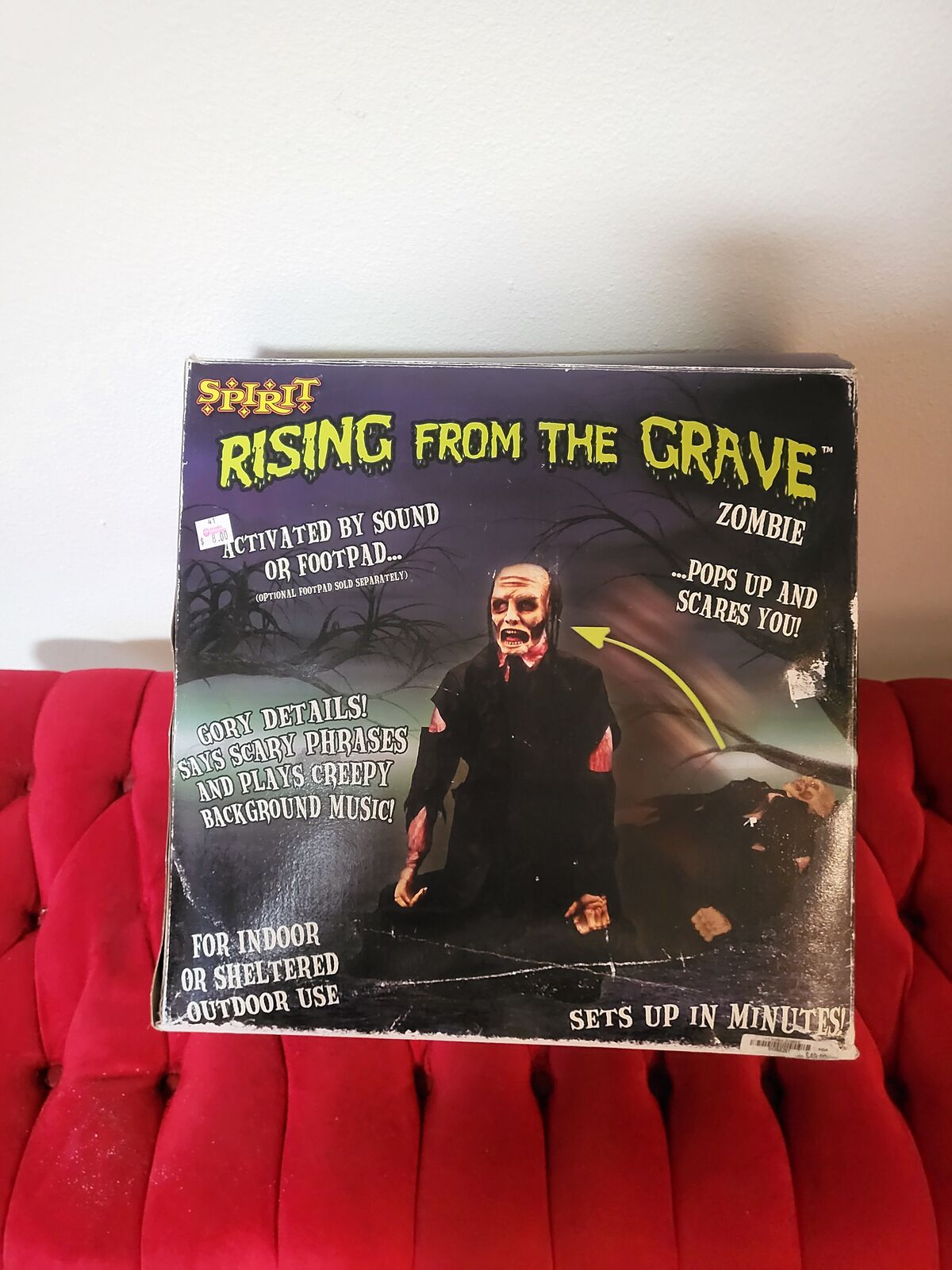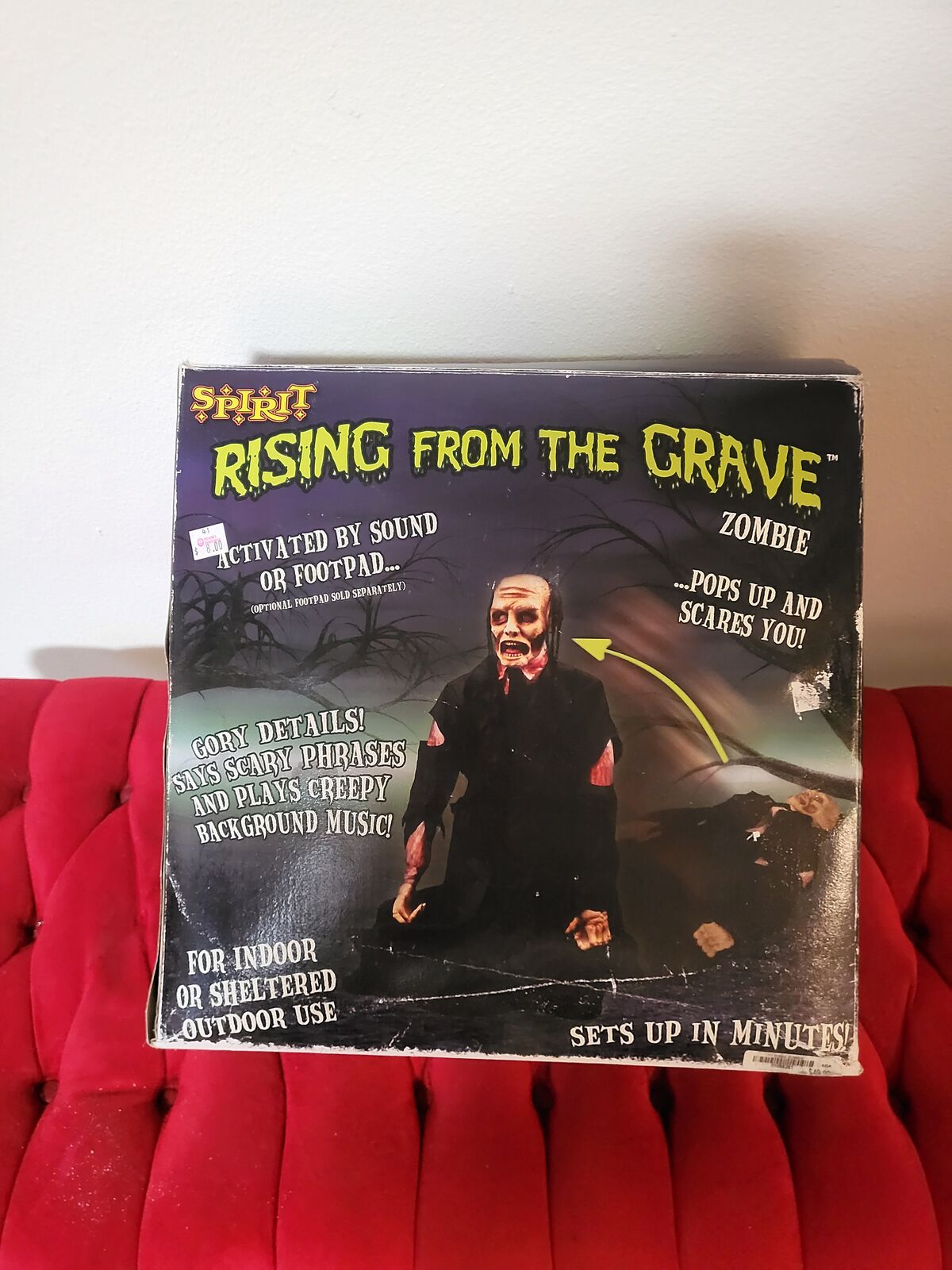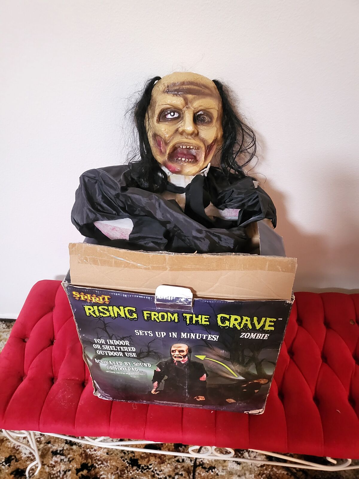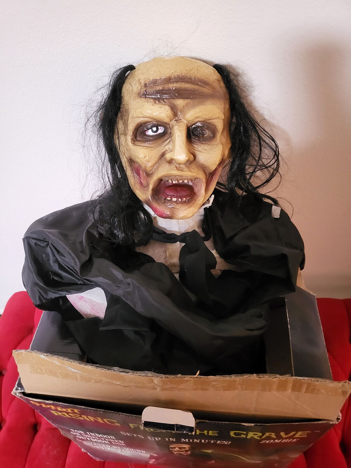 VenmoThe Rising from the Grave Zombie. It’s a zombie lying down and wearing tattered black clothing. When activated, it rise up in a swift motion, and speaks an eerie phrase.
