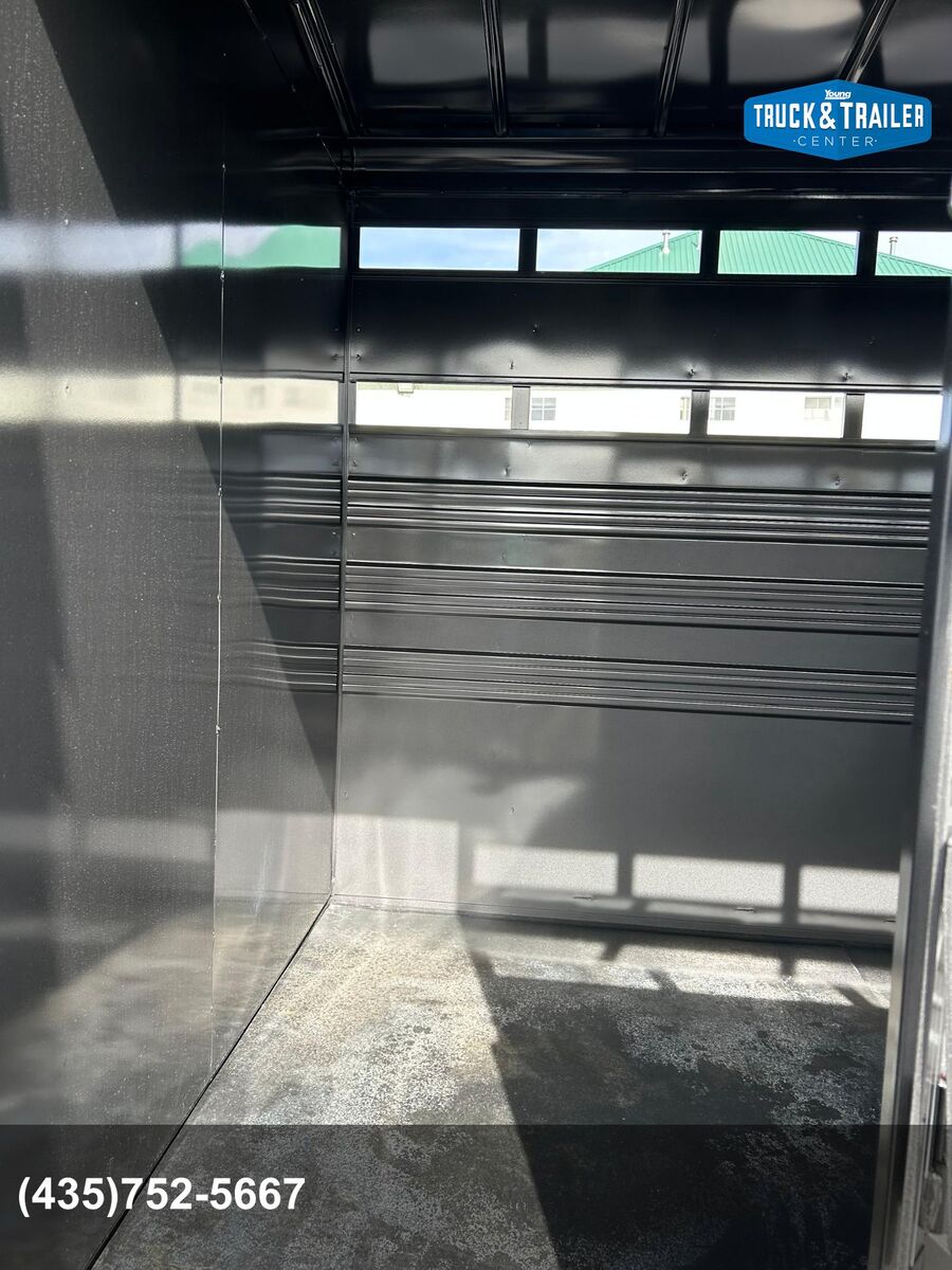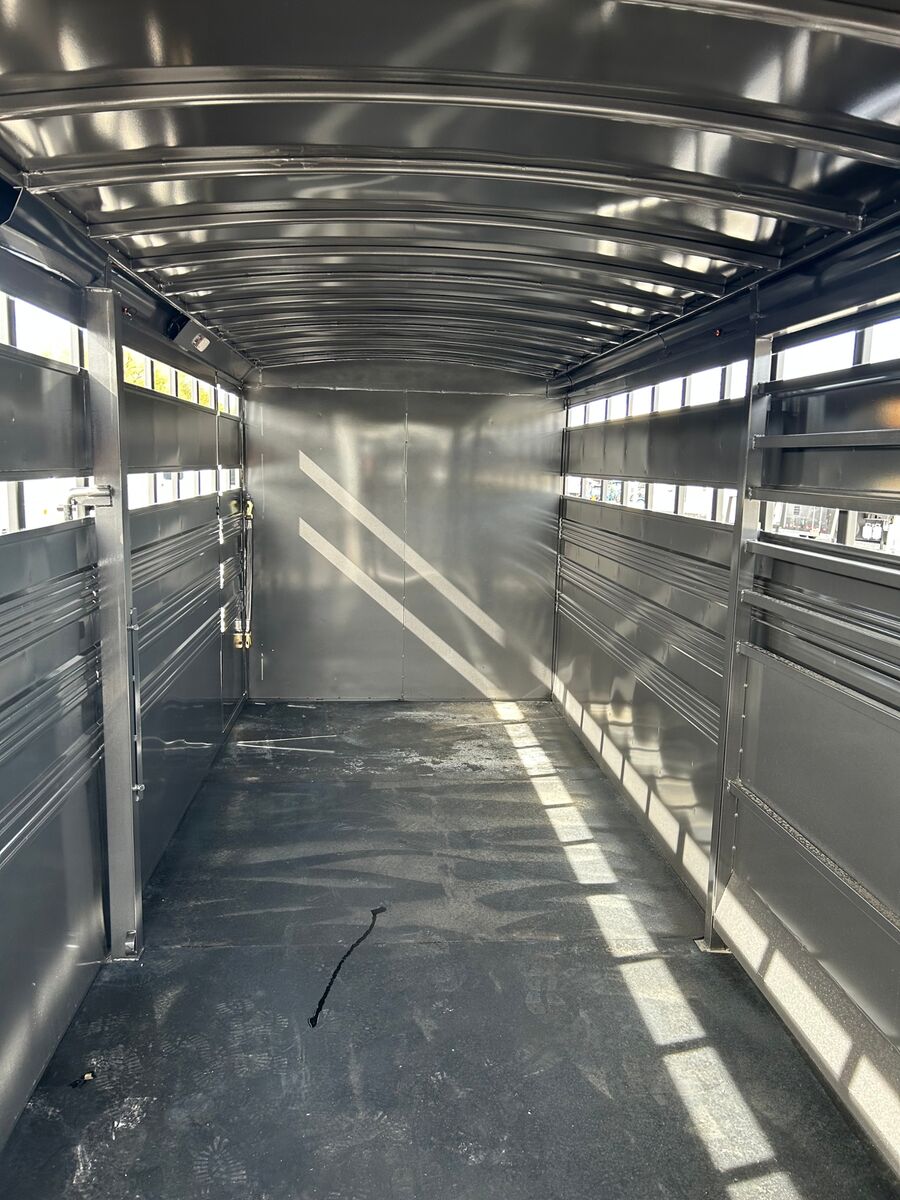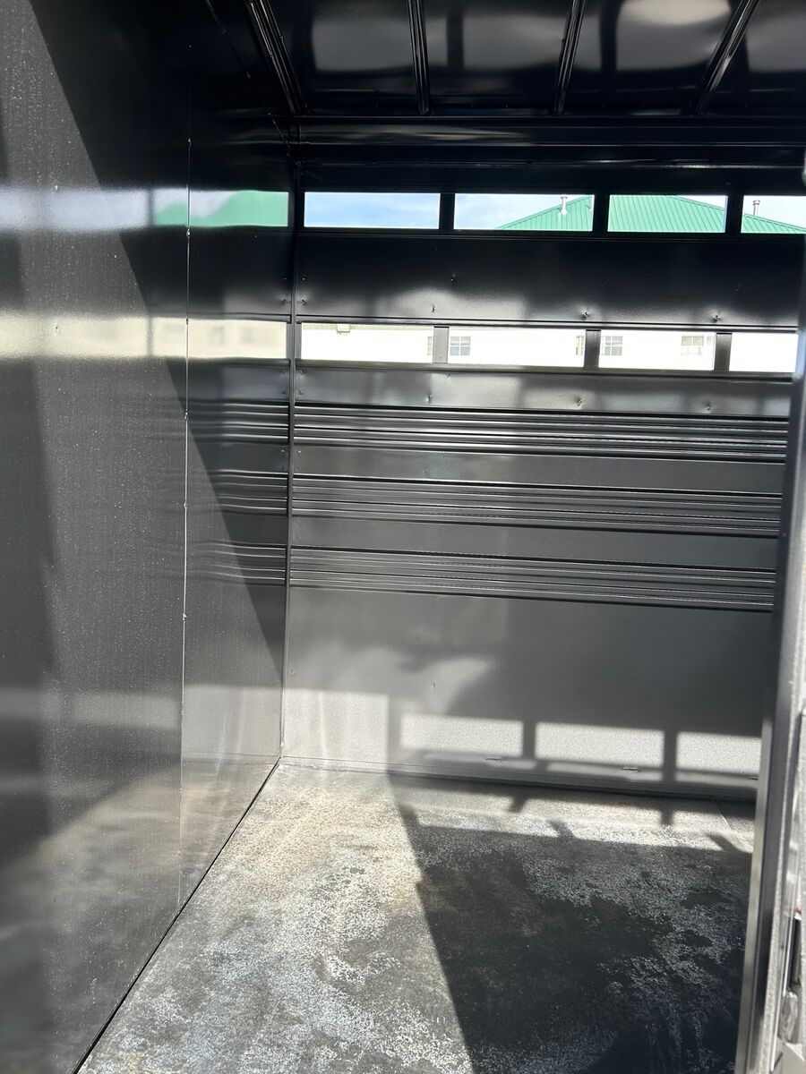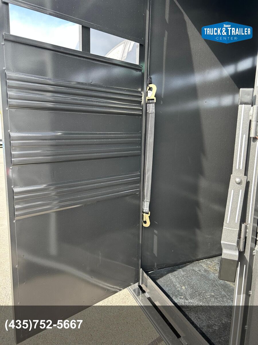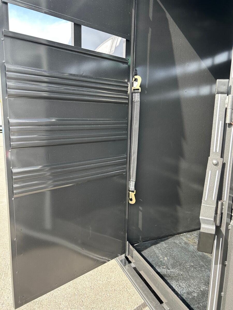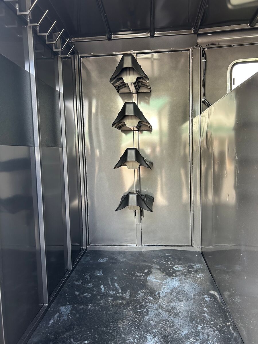 Trailer has 4' Front Tack Room Saddle Racks Bridle Hooks Windows in nose Floor Mats 7'Tall Standard Features Slope Nose 6’6” Inside Height 6'8" Wide Escape Door on Passenger Side Torsion EZ Lube Axles Electric Brakes on all 4 Wheels Crossmembers, Uprights & Roof Bows on 16” Centers (when applicable) 8 Bolt Hubs with 5/8" Studs 1 LED Dome Light per Compartment Fold Down Calf Gate in Nose Sealed Beam Recessed L.E.D. Lights Spring Loaded Dual Pin Jack Extended Angle Iron Running Boards Spare Tire Back Gate w/ Slatted 1/2 Slide, Slam Latch & Butterfly Latch 3” x 5” Frame Adjustable 2-5/16” Coupler Spray on Gravel Guard 7-Prong Cold Weather Cord w/Junction Box Undercoat Inner Fenderwells Breakaway Battery Box with Charger and Tester Plexiglas Track Rubber Rear Bumper Safety Transport Chains & Hooks