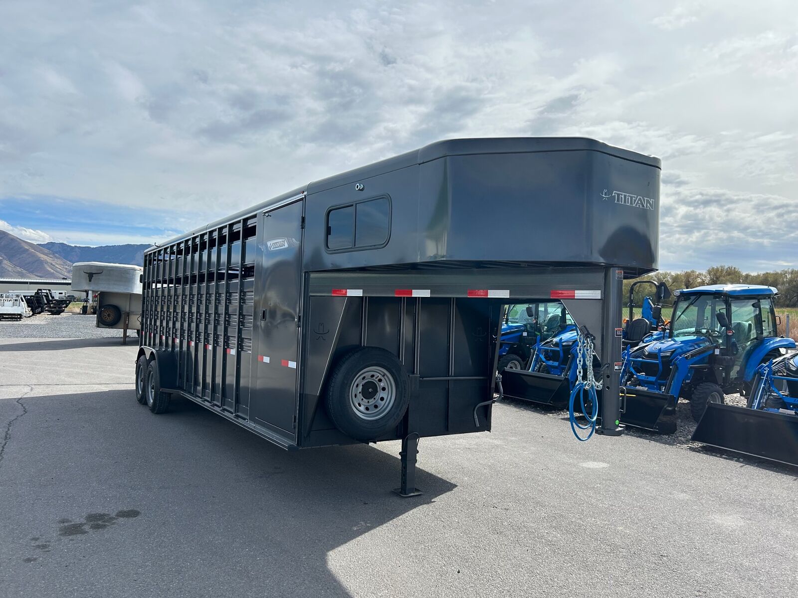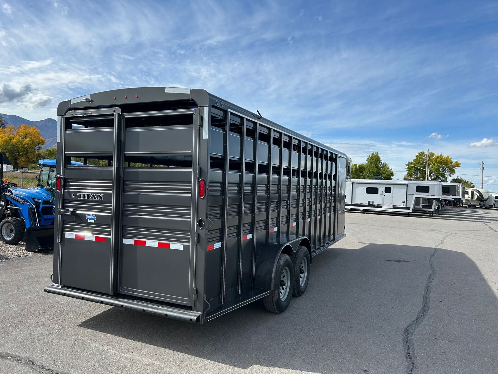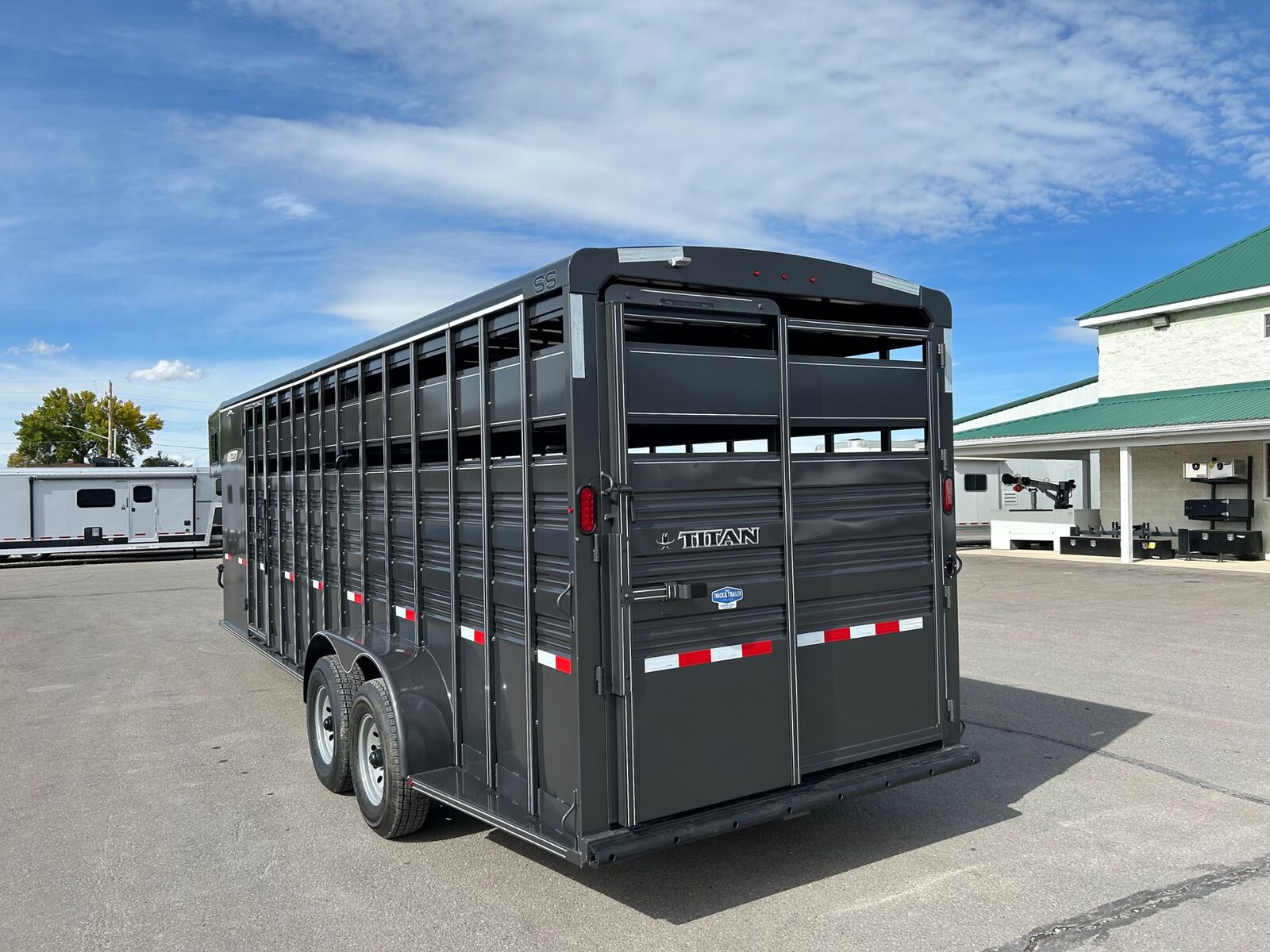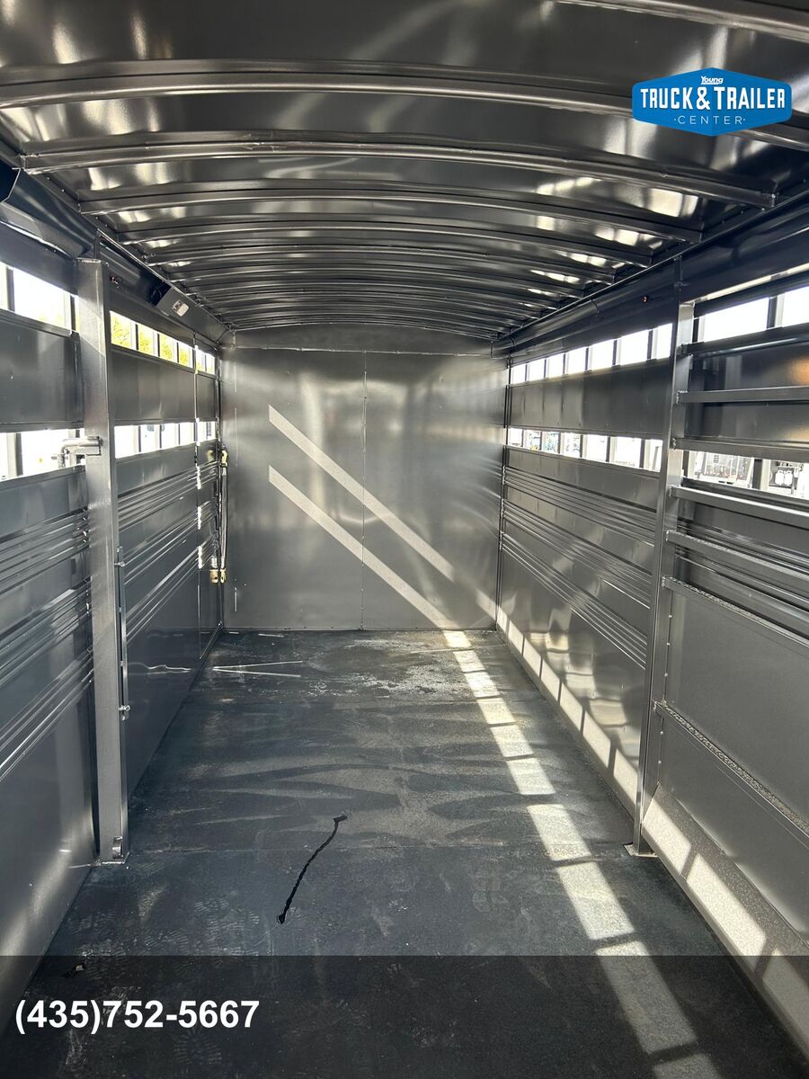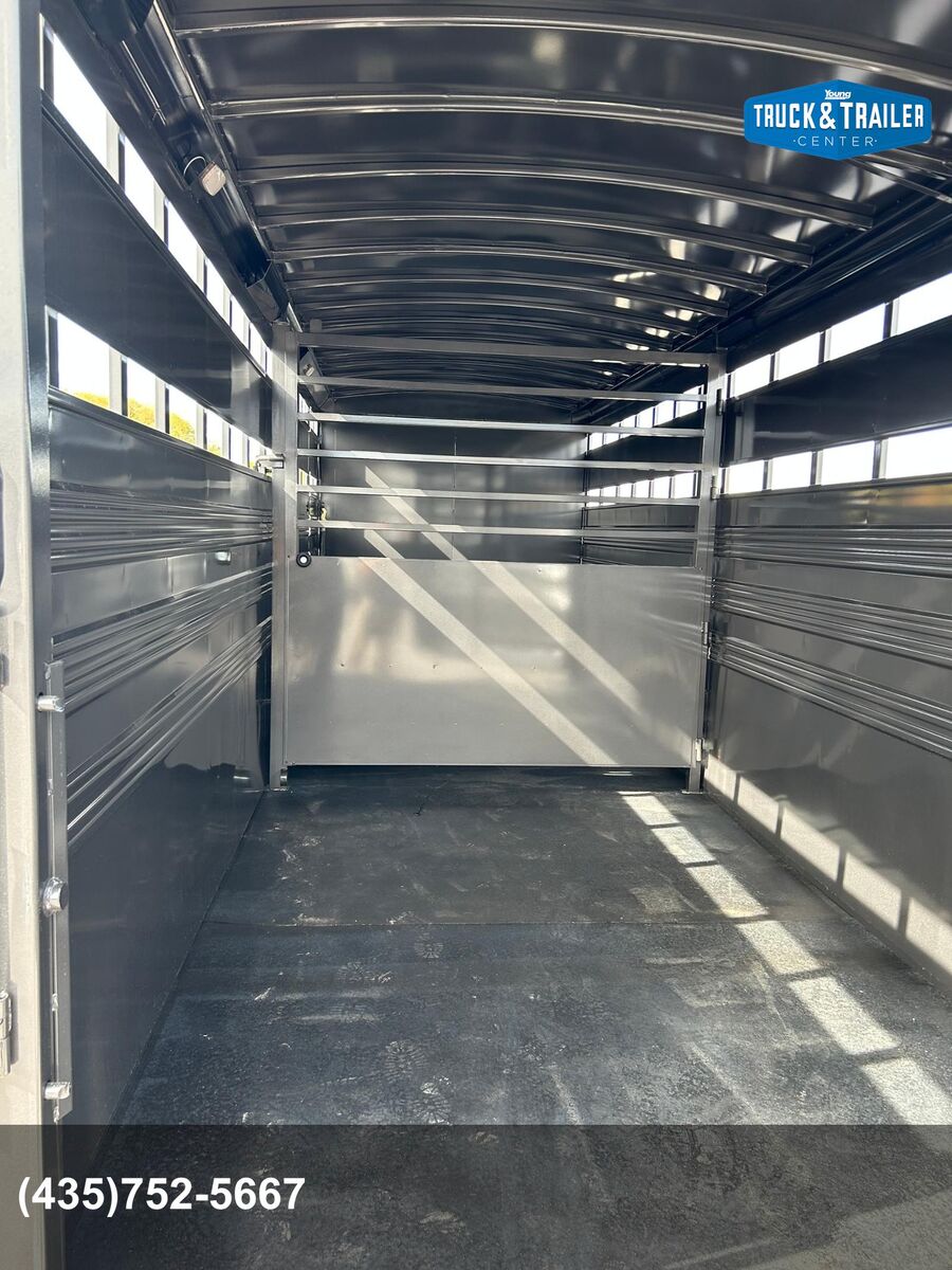 Trailer has 4' Front Tack Room Saddle Racks Bridle Hooks Windows in nose Floor Mats 7'Tall Standard Features Slope Nose 6’6” Inside Height 6'8" Wide Escape Door on Passenger Side Torsion EZ Lube Axles Electric Brakes on all 4 Wheels Crossmembers, Uprights & Roof Bows on 16” Centers (when applicable) 8 Bolt Hubs with 5/8" Studs 1 LED Dome Light per Compartment Fold Down Calf Gate in Nose Sealed Beam Recessed L.E.D. Lights Spring Loaded Dual Pin Jack Extended Angle Iron Running Boards Spare Tire Back Gate w/ Slatted 1/2 Slide, Slam Latch & Butterfly Latch 3” x 5” Frame Adjustable 2-5/16” Coupler Spray on Gravel Guard 7-Prong Cold Weather Cord w/Junction Box Undercoat Inner Fenderwells Breakaway Battery Box with Charger and Tester Plexiglas Track Rubber Rear Bumper Safety Transport Chains & Hooks