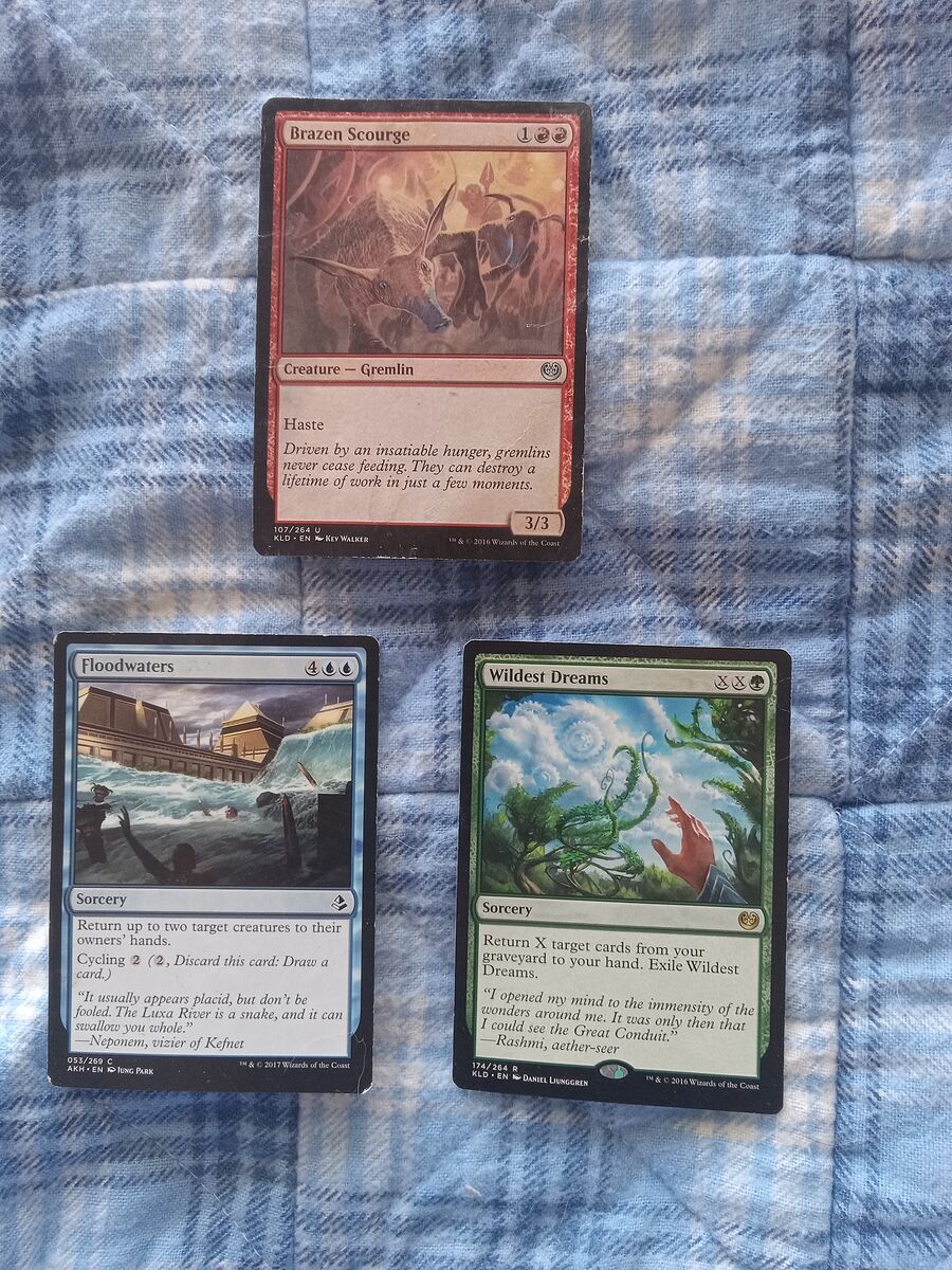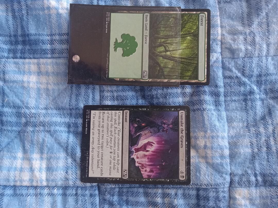 Magic The Gathering cards. 10 cards. Some in mint condition. "Brazen Scourge" $0.20, $0.15 to $0.29, "Wildest Dreams" $0.25, "Unmake The Graves" $.03 to $0.20, "Forest", rare variation, I think. I see the same card with different drawings sell for $7.99. I am going to start this one at $11.00 and take offers. Maybe it too is only worth a few pennies, sp I am open to better information. I looked through many lists but could not find this card: "Swamp", another rare card? Start at $8, taking offers and info. "Pharika’s Chosen", $0.06 to $0.29. Asking $10 for all the cards.