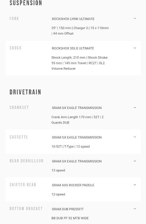 KEY FEATURES +150mm RockShox Lyrik Ultimate Fork w/ upgraded Charger 3.1 damper +145mm RockShox Super Deluxe Ultimate Shock +SRAM GX Wireless Transmission Drivetrain +SRAM Code RSC brakes