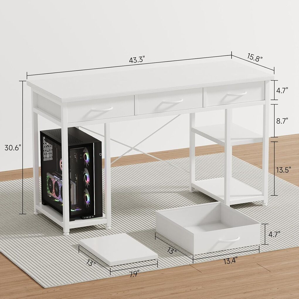 This home office desk is manufactured by Flrrtenv and comes with 3 drawers and 2 storage shelves. Fabric drawers are lightweight and save time and effort to install. Adjustable shelf brackets on both sides make the structure of the whole computer desk more stable, and can be placed the computer host, so that everything is well organized.