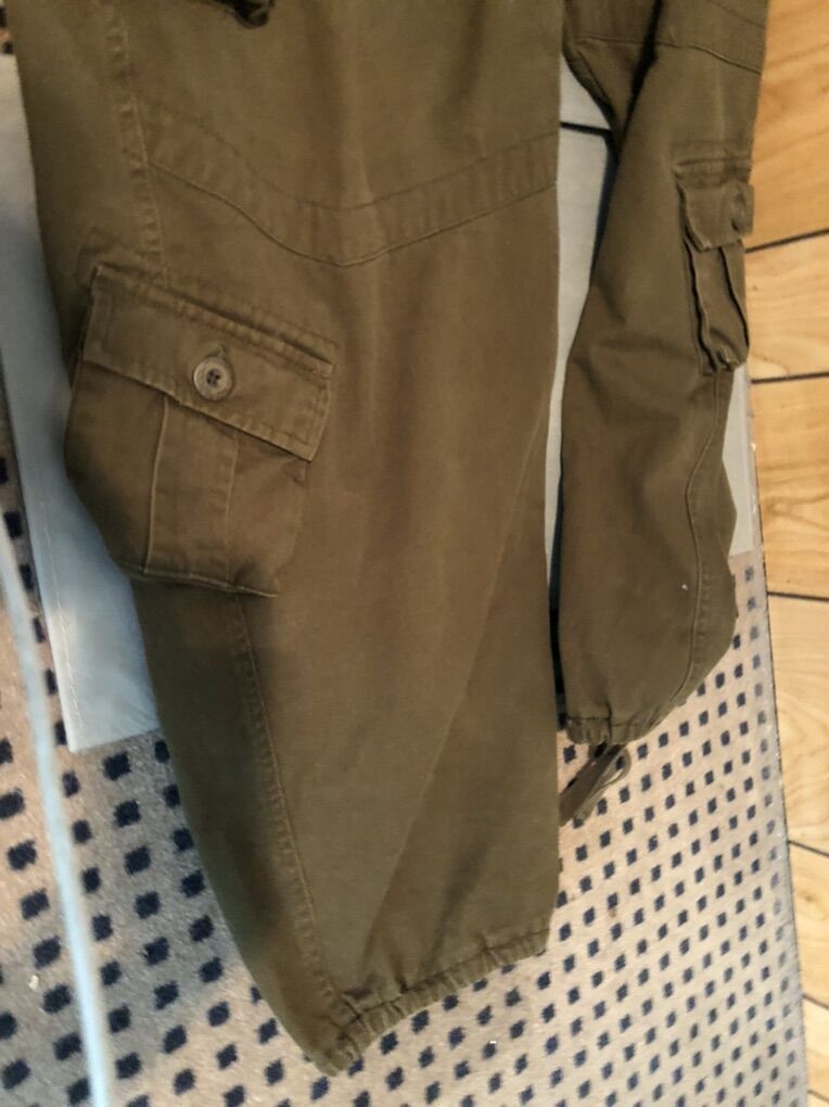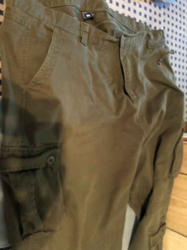 PayPalKhaki Green Military grade Cargo Pants. Fits 44” in waist and 43” in Length. Cinching cords in hemline for tightening at the pant leg bottoms. Like brand new.