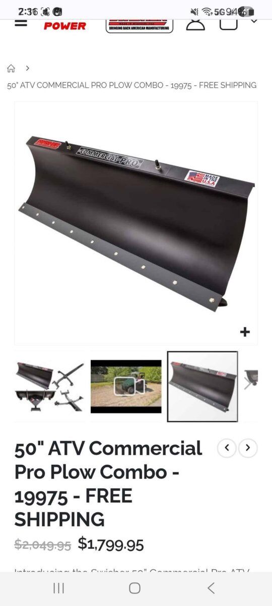 Swisher 50 inch atv snow plow kit. Really well made kit with attachment that runs the full length of the bike chassis. Great shape.