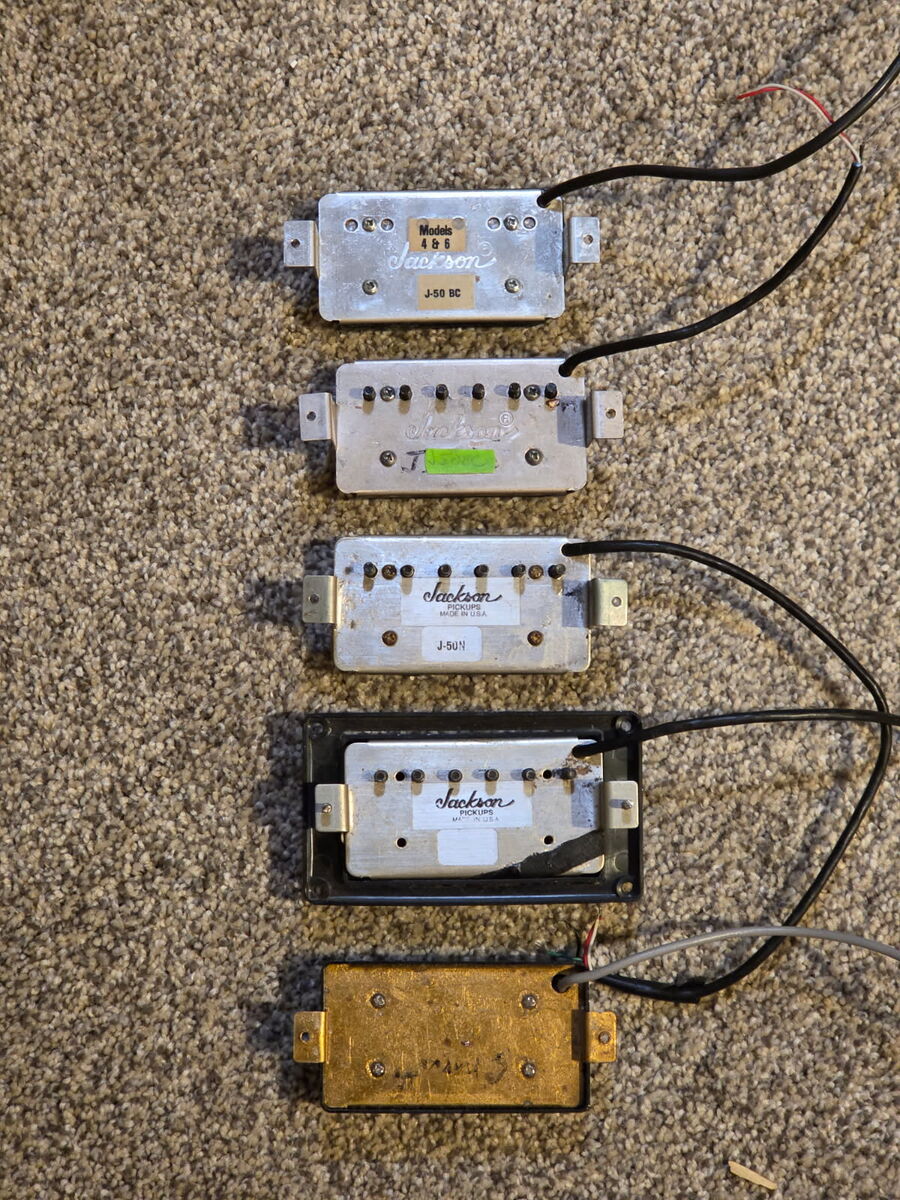 PayPalI have the following Jackson pickups: Jackson J50N (USA) 8.23k $75 Jackson J50N (faded, USA) with cover and oversized pickup ring 8.33k $85 Jackson J50BC (handwritten) 8.79k $95 Jackson J50BC (models 4&6) 9.0k $95 Charvette bridge humbucker 7.94k $35 I'm 90 percent sure the one with the cover is a J50N. The cover is not glued on.