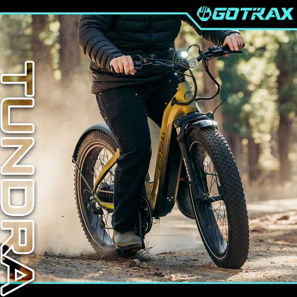 The GOTRAX Tundra All Terrain Electric Bike is the ultimate off-roader. Thanks to shock absorbing 26" fat tires and an adjustable front suspension system. Ideal for weekend adventurers looking for a little more power in their rides.