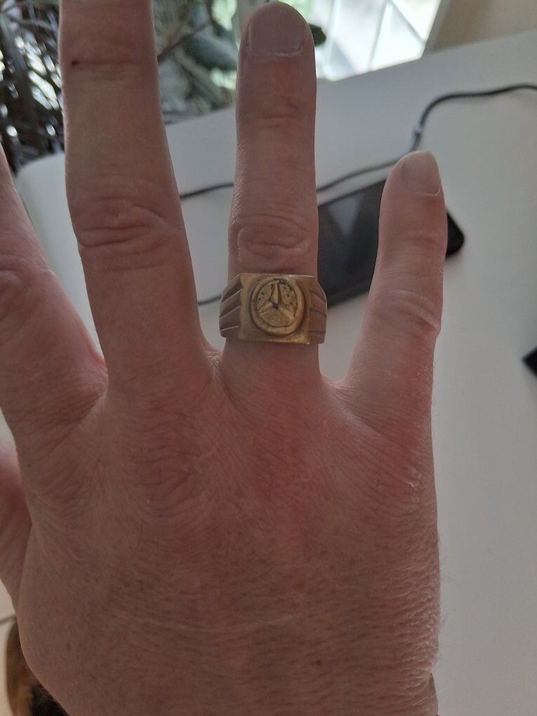 Pure 18 Karet Yellow Gold, stamped 75 % pure gold mixed with other metals, Ring Size 12, and weight is 16.6 grams