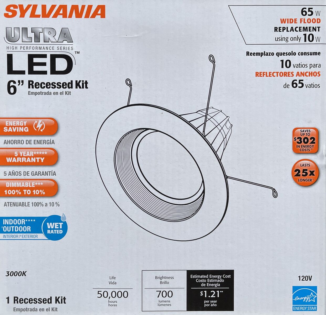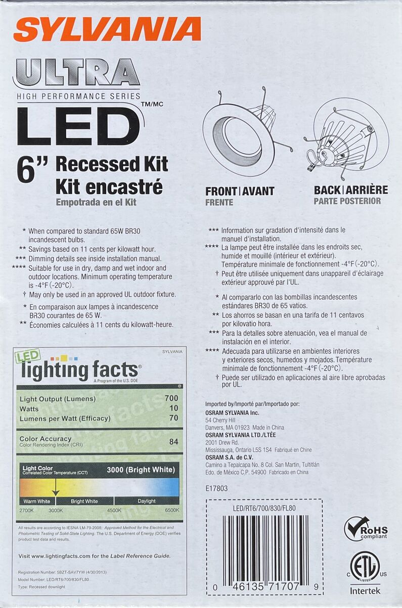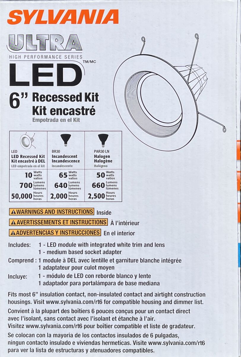 The SYLVANIA ULTRA is a 6" compatible LED recessed downlight kit creating high performing white light and is optimized for new construction and retrofit applications. Installation is done quickly and easily in most standard 6" Insulated Ceiling (IC) housings, Airtight (AT) housings and non-IC housings.