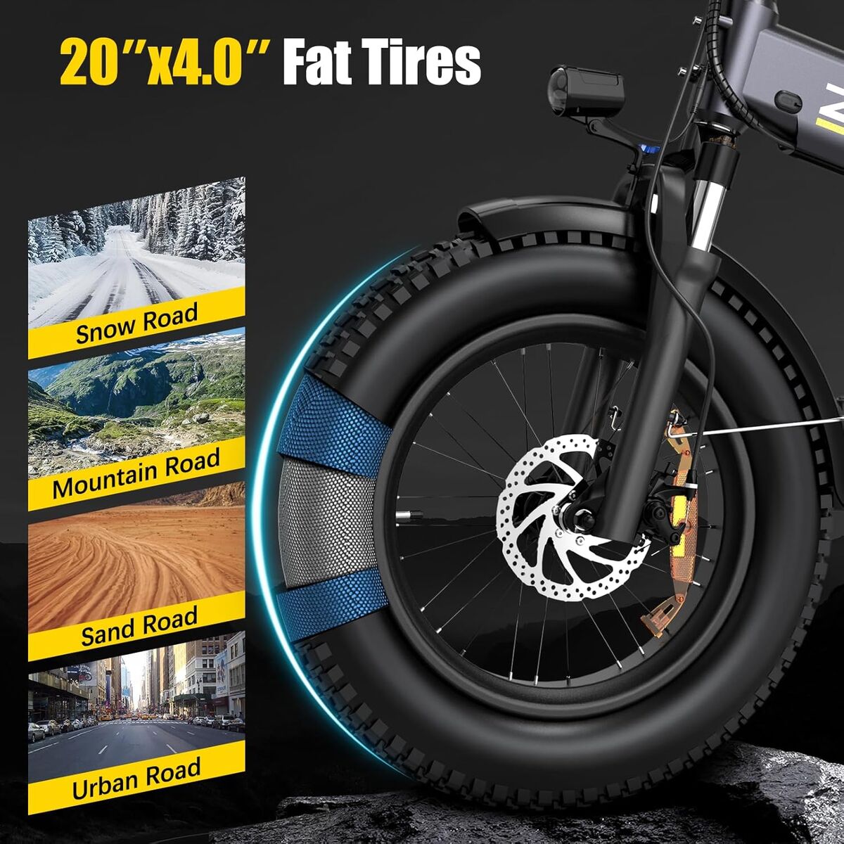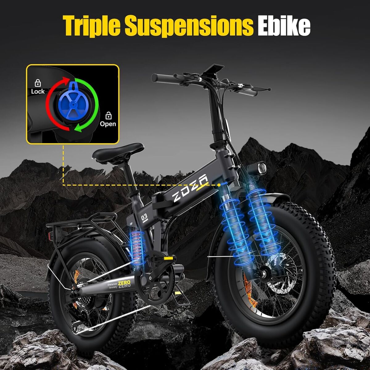 [๐๐จ๐ฆ๐๐จ๐ซ๐ญ๐๐๐ฅ๐ & ๐๐ฆ๐จ๐จ๐ญ๐ก ๐๐ข๐๐ข๐ง๐ ] - ZA03 e bike has dual lockable front suspension and rear suspension can absorb bumps well. 20"x 4.0" fat tires conquer all sorts of terrains, including mountain roads, snow roads, beach roads, rocky roads, and even urban jungles. All these make you can enjoy smooth and comfortable riding experience whether you ride ZA03 electric bicycle for daily commuting, outdoor adventures, and leisurely cruising around town.