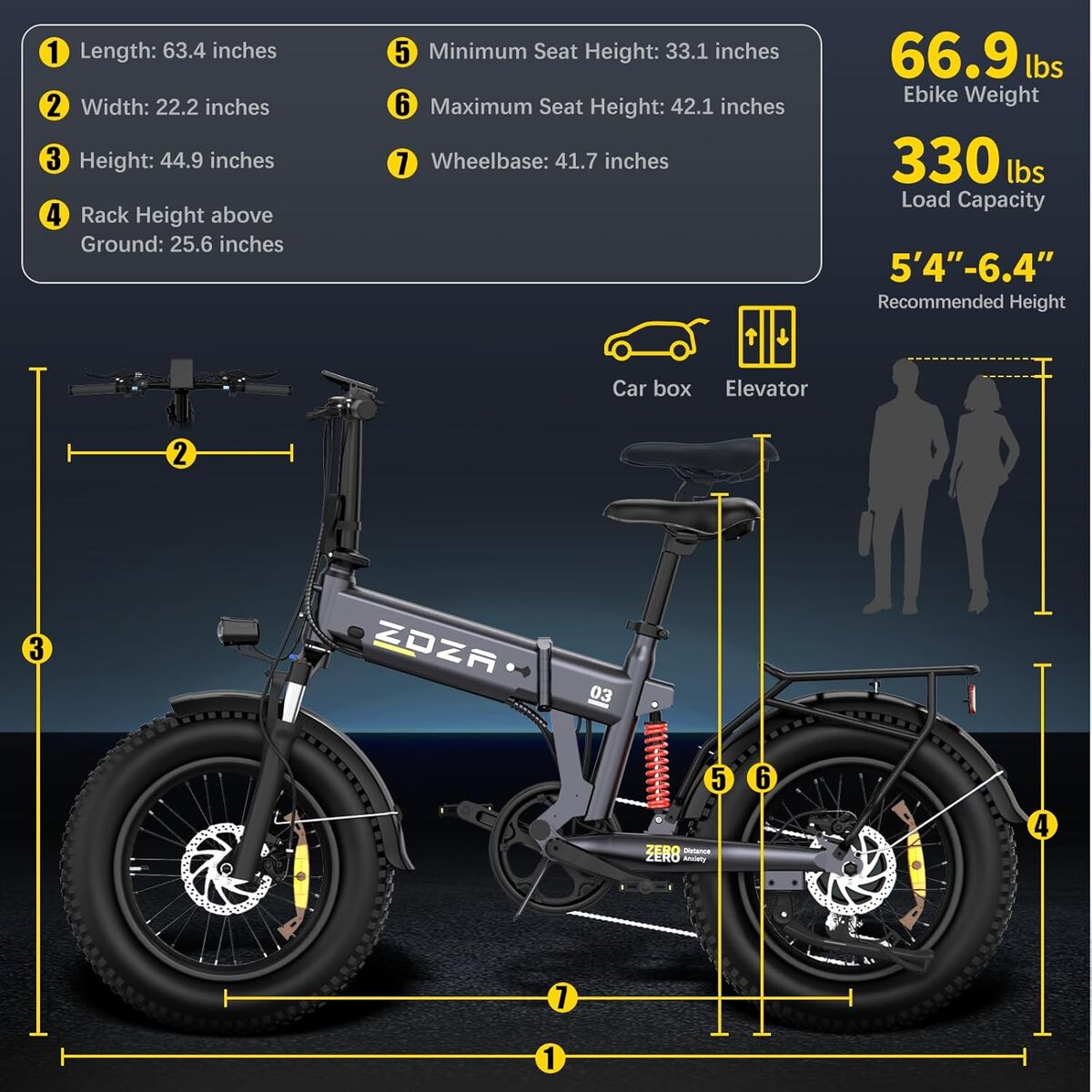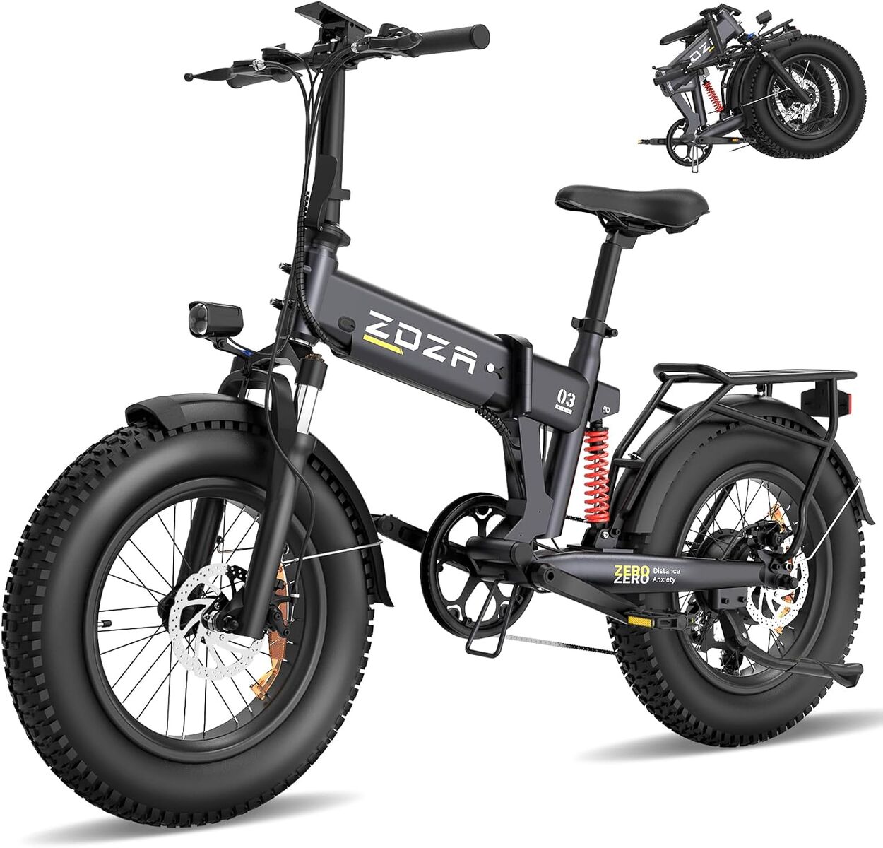ZDZA ZA03 Electric Bike for adults. 20" Step Thru Ebike. 750 watt nominal Motor Performance Peak 1200W. Max Speed. Approx. 28 mph. Max Range (PAS Mode). 65 Miles. Suspension. Front and Rear. Tires 20 inch by 4 inches great for soft ride, trails and snow traction