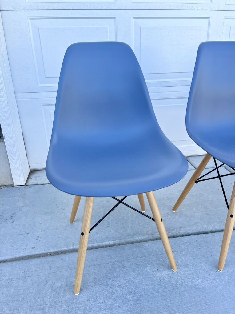 ApplePay4 blue/grey mid century modern chairs. Plastic Eamse molded. Wood legs.