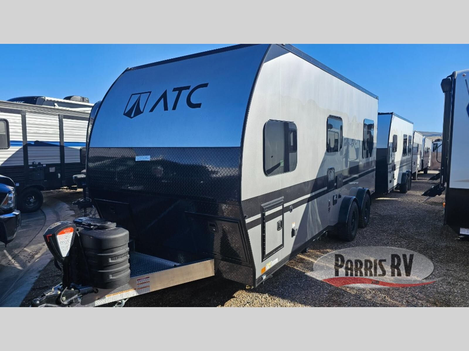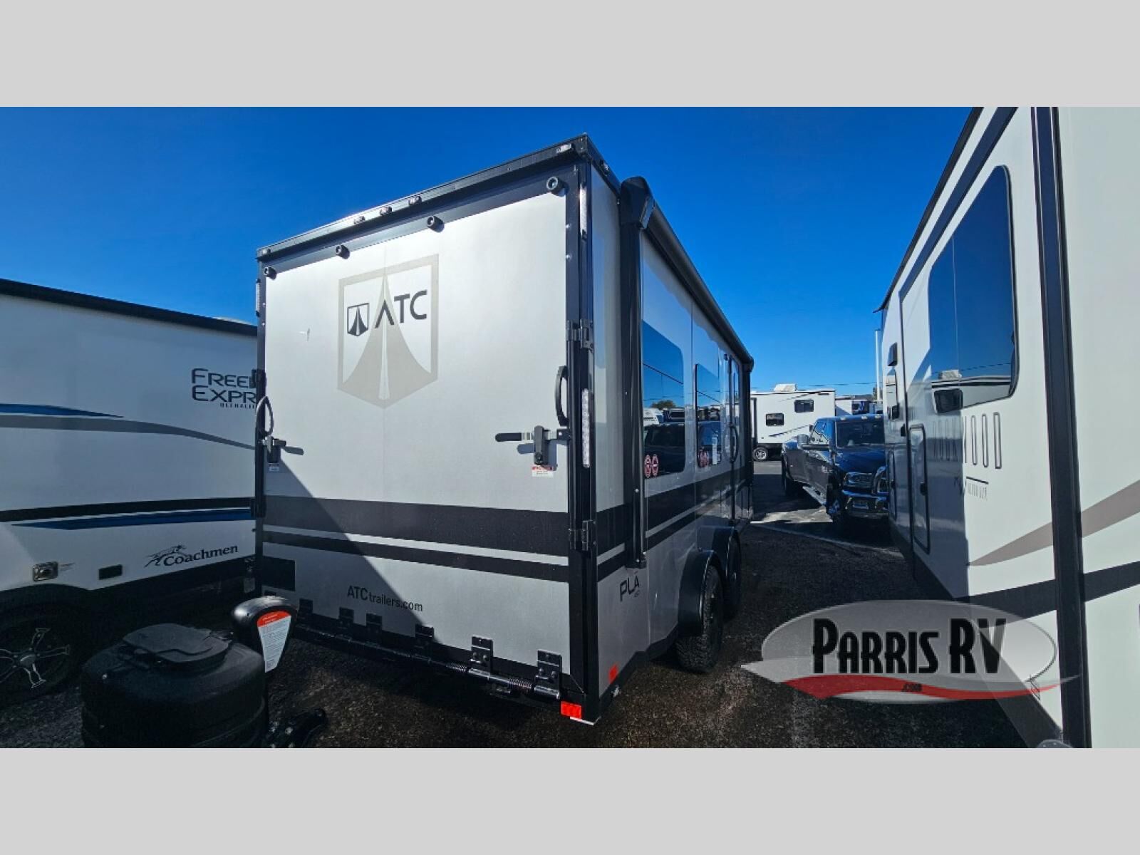 With any PLA 450 toy hauler travel trailer by ATC Trailers, you will enjoy lightweight towing and a configurable garage space for your toys, gear, and more! The all-aluminum and composite construction features no wood so you won't have to worry about rot, and the All-Weather Protection Package means you can extend your camping season. There is a 200-watt solar panel, a 100-watt inverter, and 120V/USB outlets to keep your adventures going. Outside, you'll find storage for your gear, a power awning with a light strip, sleek frameless dual pane windows, and more convenient features. The interior is just as accommodating with aluminum cabinets, dimmable can ceiling lights, configurable furniture track system, and solid surface countertops!