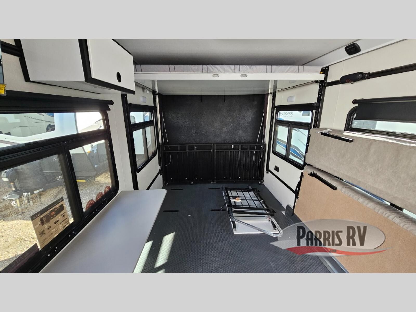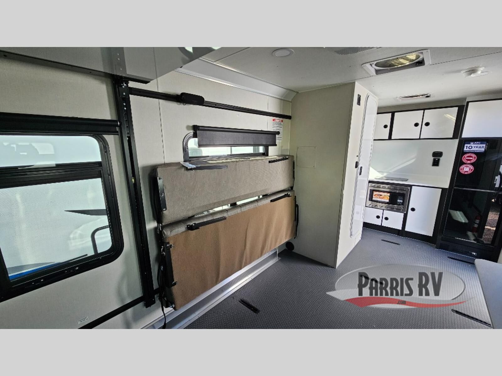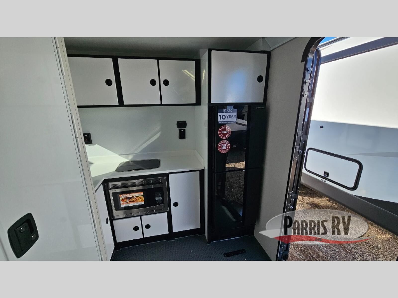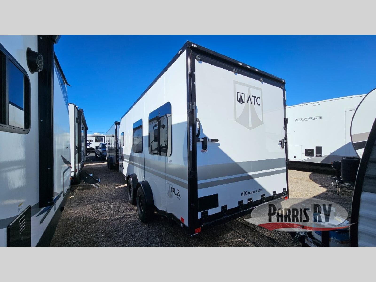 With any PLA 450 toy hauler travel trailer by ATC Trailers, you will enjoy lightweight towing and a configurable garage space for your toys, gear, and more! The all-aluminum and composite construction features no wood so you won't have to worry about rot, and the All-Weather Protection Package means you can extend your camping season. There is a 200-watt solar panel, a 100-watt inverter, and 120V/USB outlets to keep your adventures going. Outside, you'll find storage for your gear, a power awning with a light strip, sleek frameless dual pane windows, and more convenient features. The interior is just as accommodating with aluminum cabinets, dimmable can ceiling lights, configurable furniture track system, and solid surface countertops!