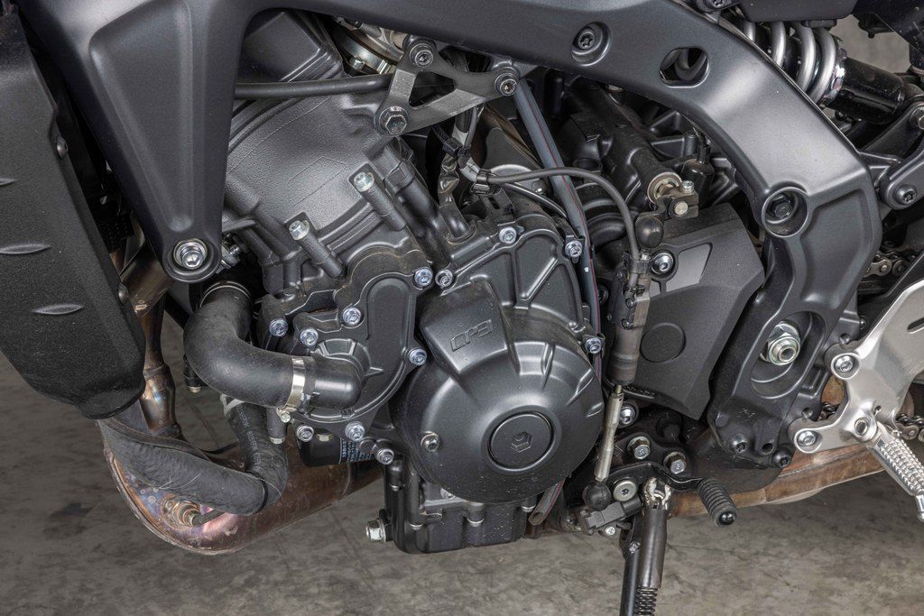The MT-09 features a newly developed 890cc liquid-cooled three-cylinder, DOHC, four-valve-per-cylinder fuel-injected (YCC-T) engine with a downdraft intake. The bore × stroke of 78 mm × 62.1 mm and 11.5:1 compression ratio provide outstanding torque with strong power delivery characteristics. Almost all of the fundamental parts of the engine, from the pistons and connecting rods to the crankshaft, camshafts and crankcase, have all been redesigned with a reduction in weight. The combination of improved combustion efficiency and lighter weight results in an impressive 11% improvement in fuel efficiency as well, from 44 MPG to 49 MPG.