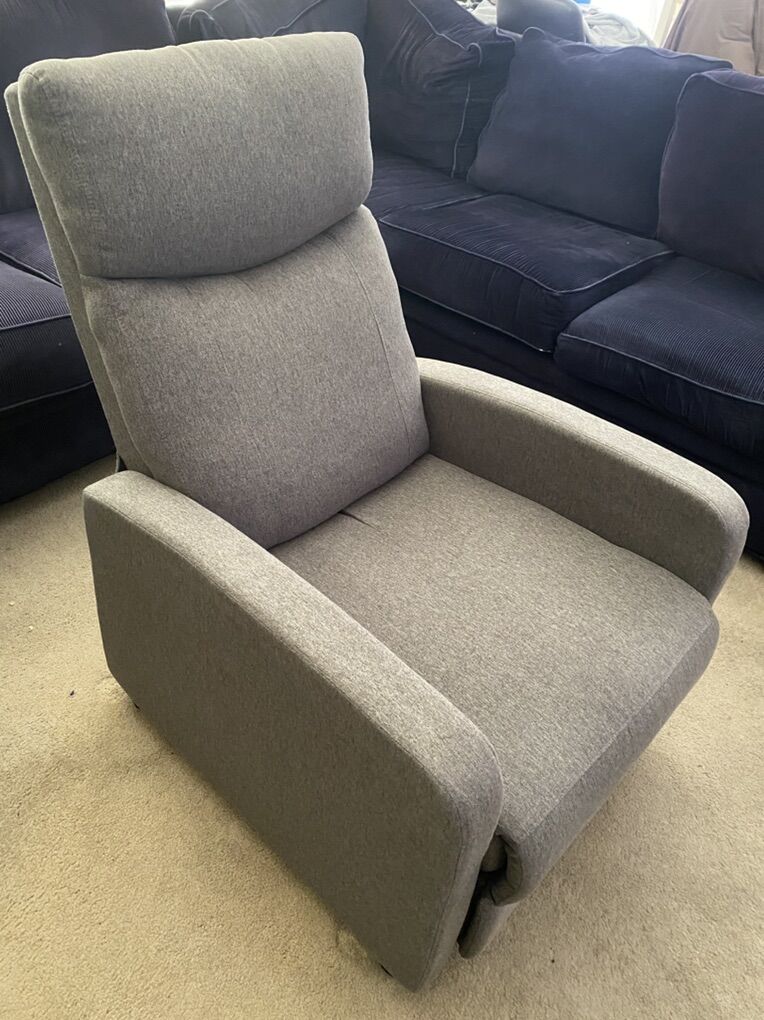 Manual recliner. Was brand new and we have used for a few months. It just doesn’t fit with our room set up. Color is a shade of gray. Still in excellent shape. Comhoma brand. Tag says it was made for Walmart. Price firm.