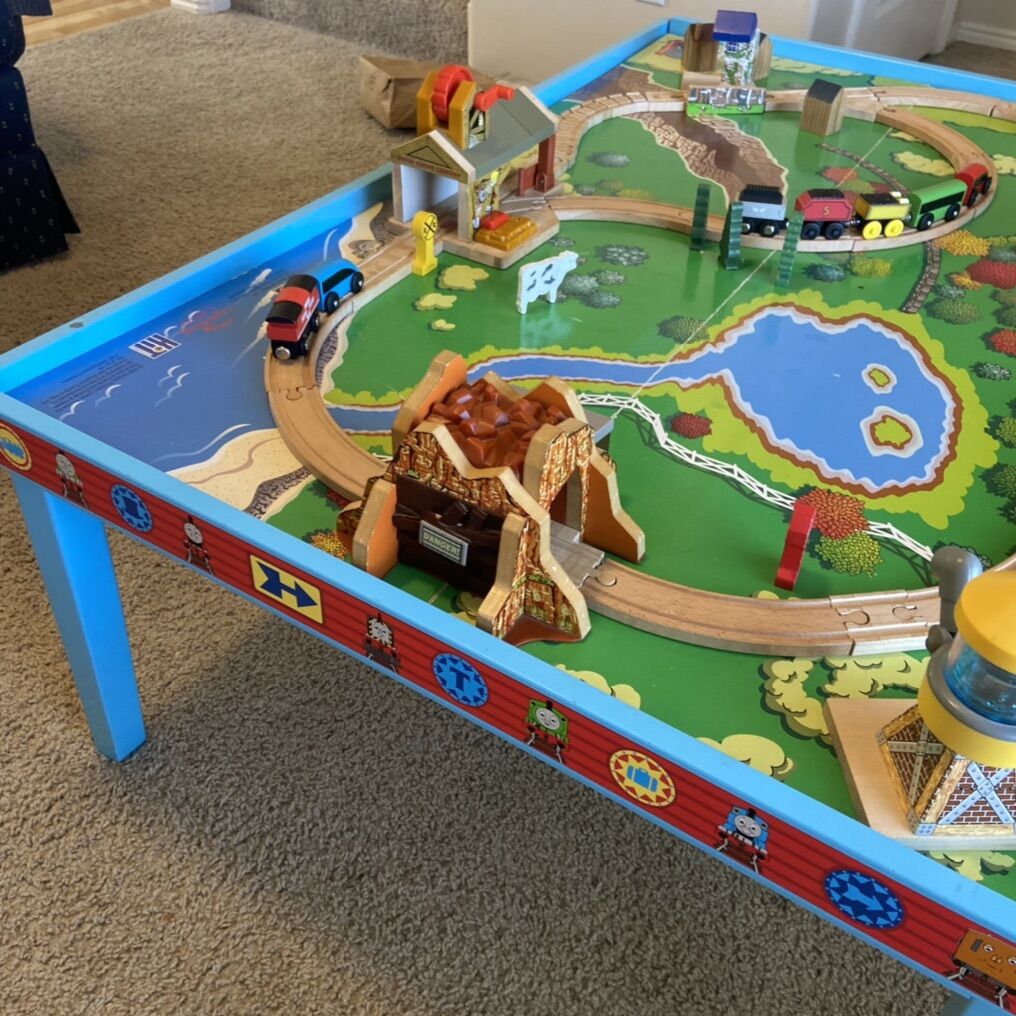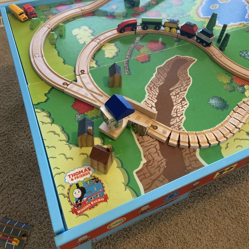 Selling this great train table! This is a great deal because I’m selling the complete set-up: the table, the trains, tracks and station parts (all SOUNDS and LIGHTS WORK) plus other small accessories. This is a quality table and will last generations. Perfect for grandparents house or if you have room in your playroom/basement. It does require some room. Please note there is no drawer and there are minor cosmetic imperfections. This didn’t affect hours of happy play with trains for us. It is a very sturdy table. It does go apart, but will be so much easier if you can pick it up without taking apart.