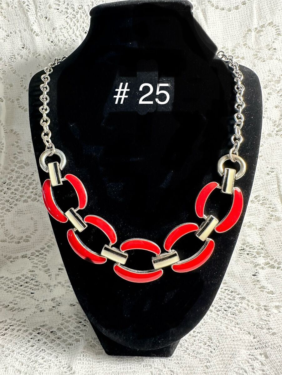 Vintage 1990's Red, White & Black Enamel Statement on Silver Necklace.
