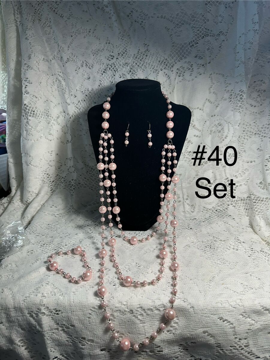 Pink Pearl Tripple Drop Necklace with Earrings and Bracelet.