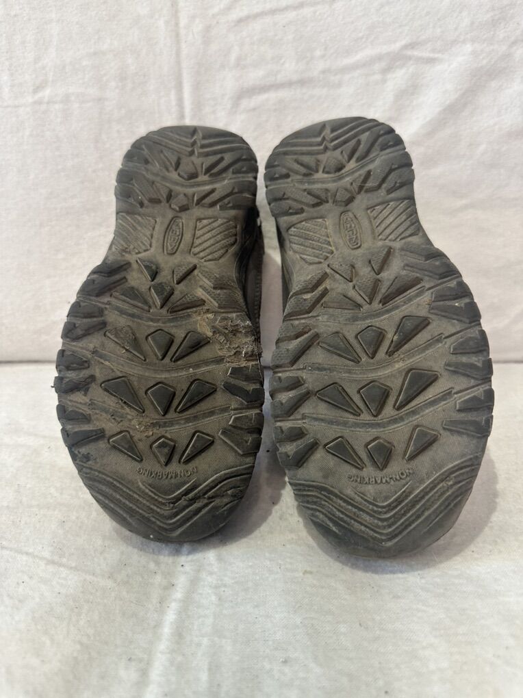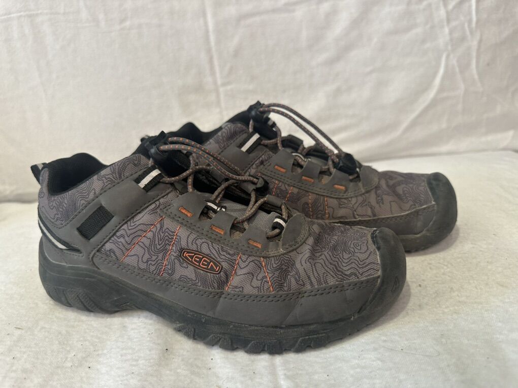 Keen size 3 gray textile with orange trim and elastic laces with a toggle at the top hiking shoes. These are in good condition, see photos for detail details. I take cash or Venmo, but cash is preferred. Text is best. 801-201-4446. Check out my other ads for additional sizes and styles.