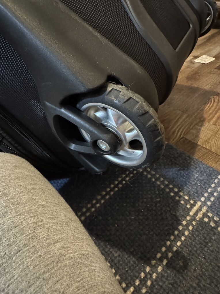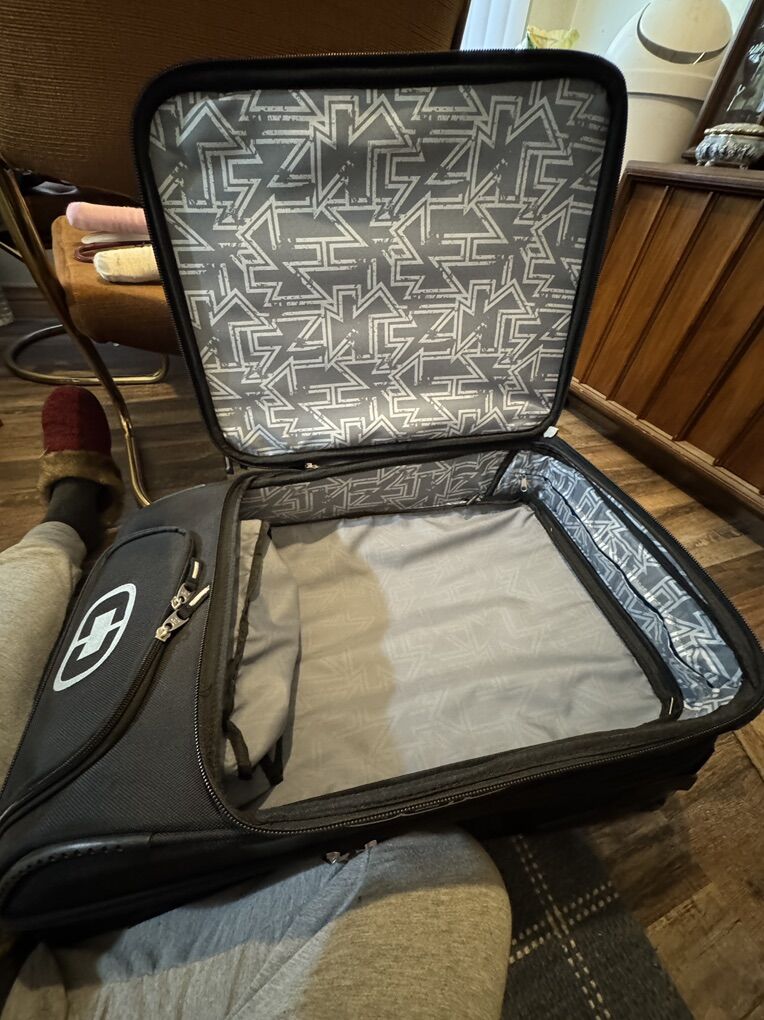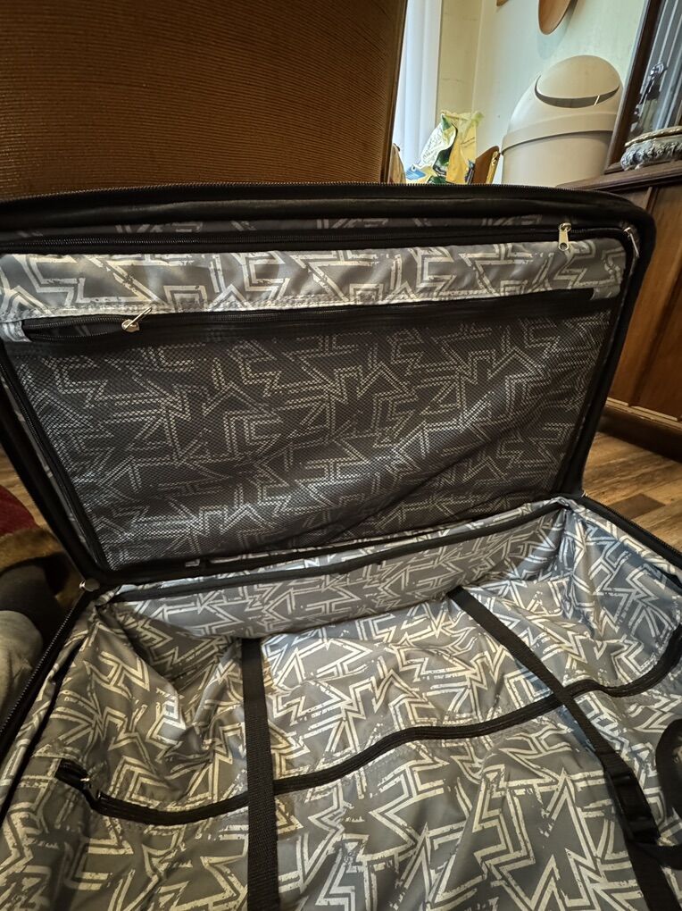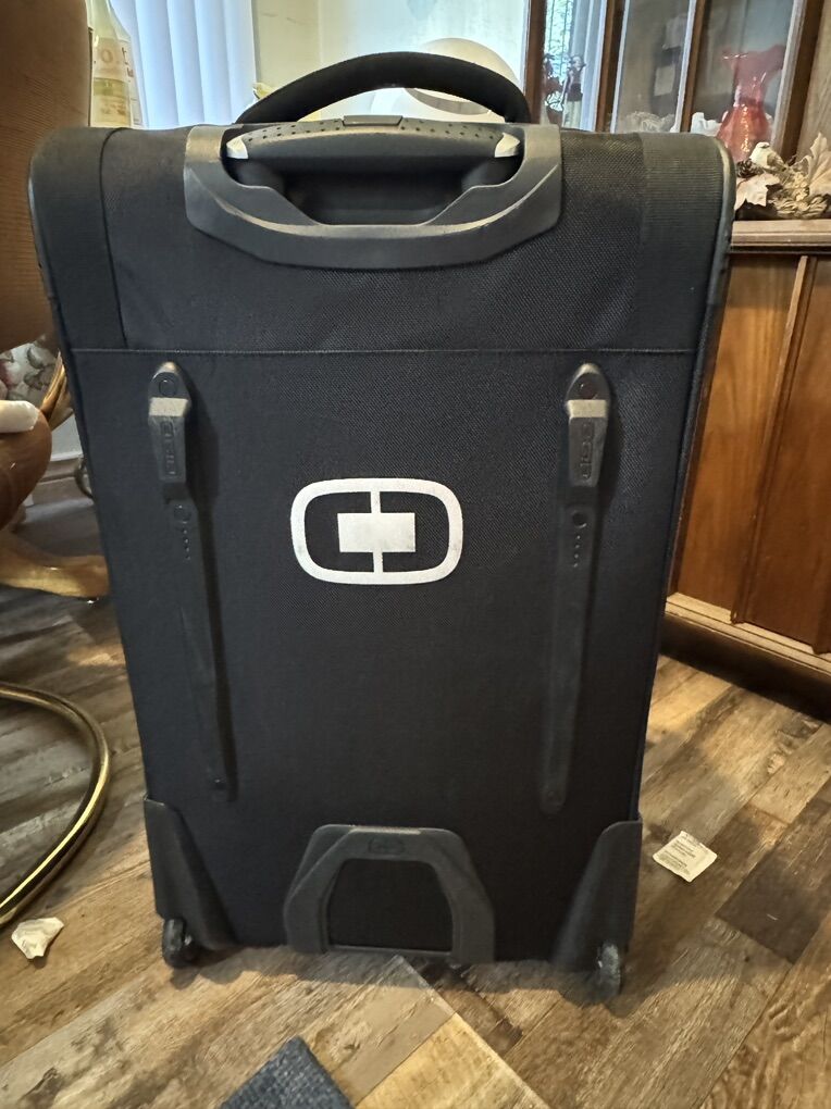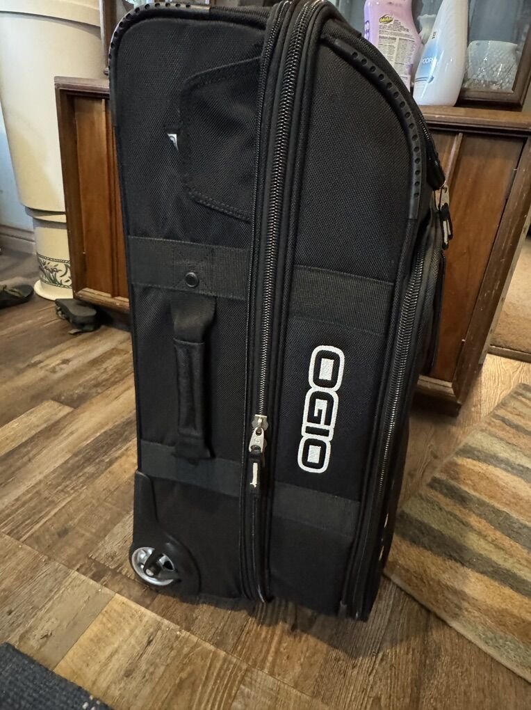VenmoOgio travel bag with 2 areas for garments, lined interior, garment straps, large exterior zippered pockets, retractable locking handle and in line skate wheels. Used one time. Measures: 26”h x 15”w x 16.5”d