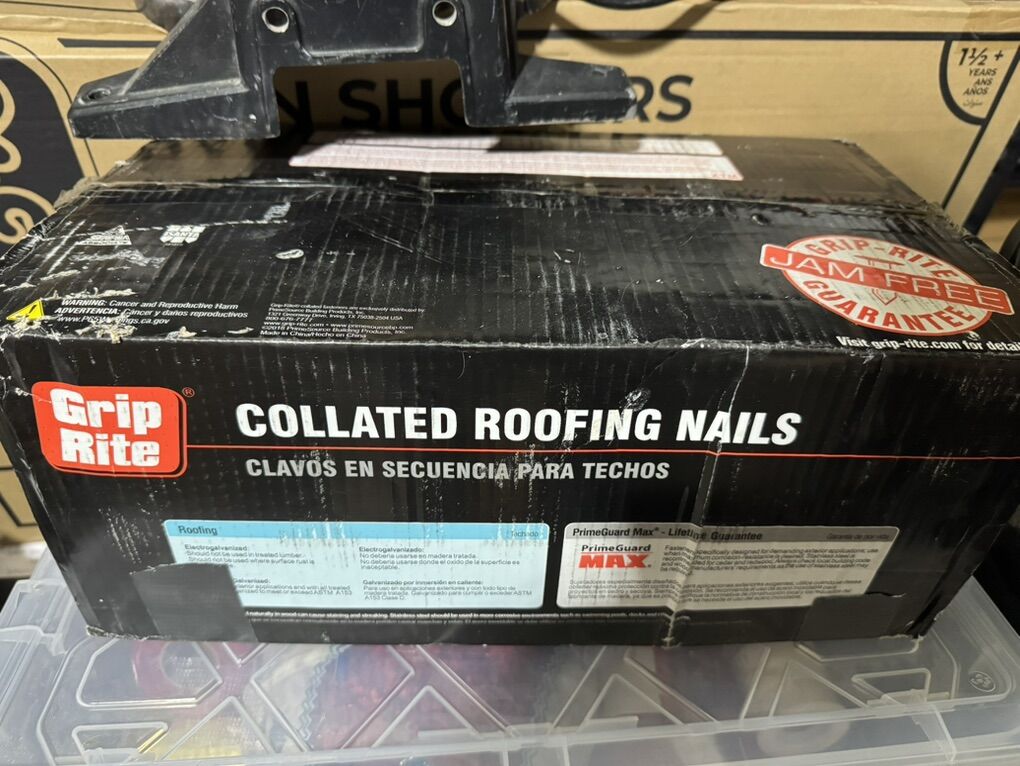 Venmo15 degree wire weld coil, 1-3/4”x.120” - smooth shank roofing nails 7200 count. Full box bottom dropped out that’s why it’s duct taped. More than welcome to cut it open to verify.
