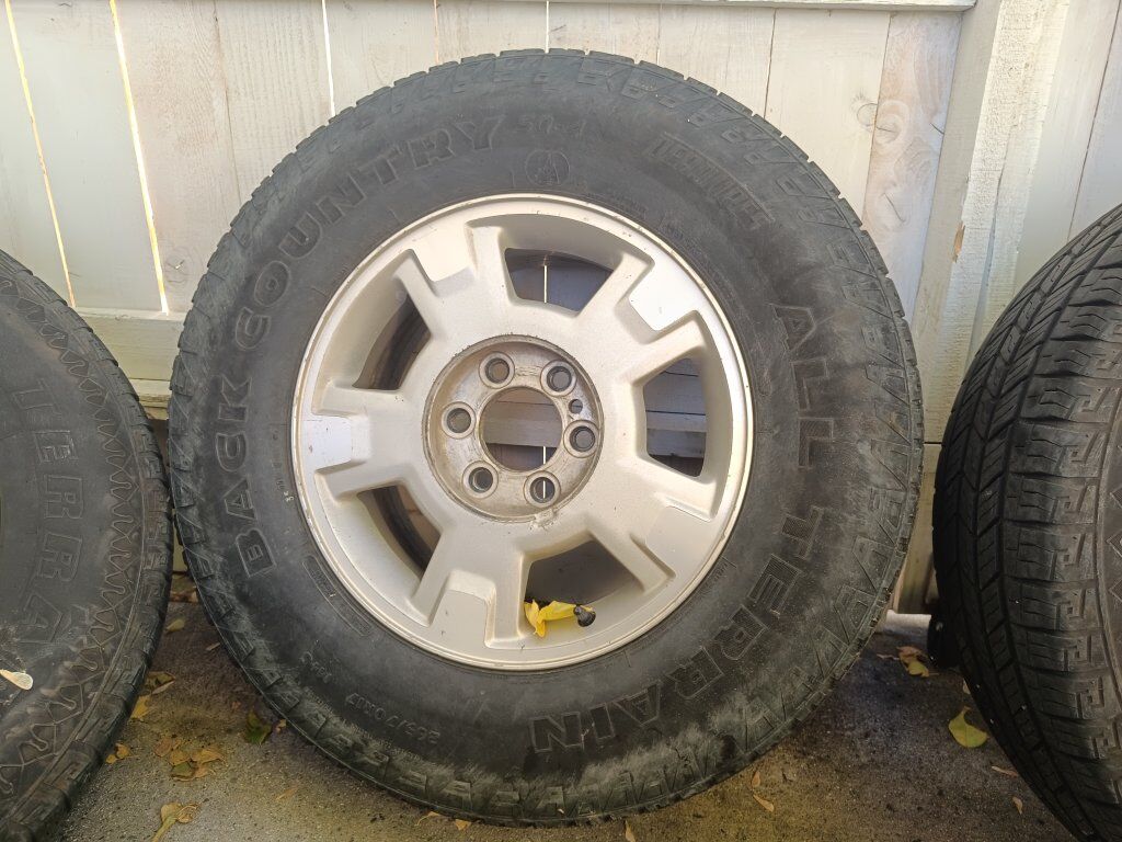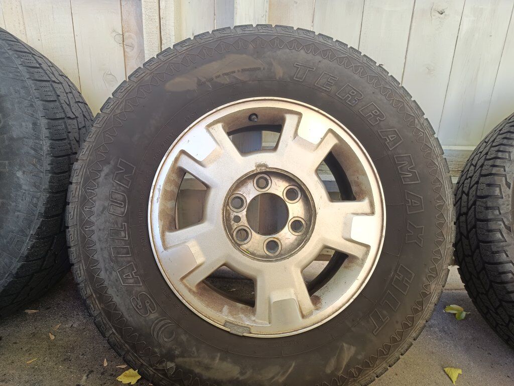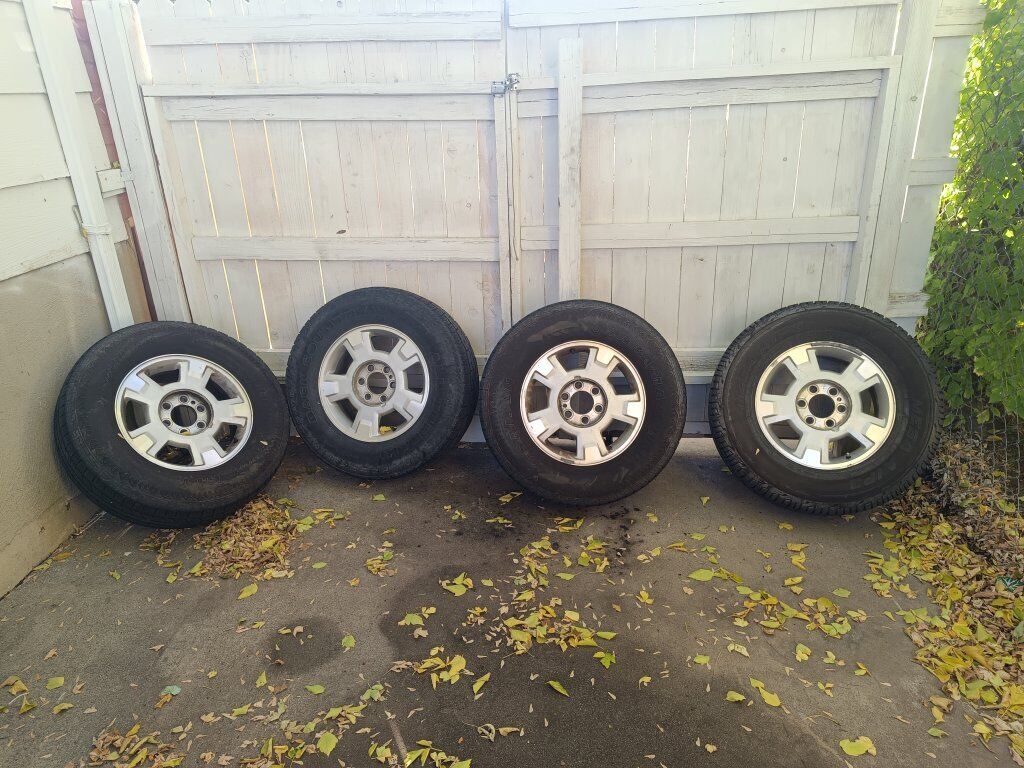 4 mismatched tires, pretty decent tread. 4 17 inch Ford wheels off of a 2013 f150 (6 lug) with center caps. Need the room in my yard come get em. OBO 265/70/17