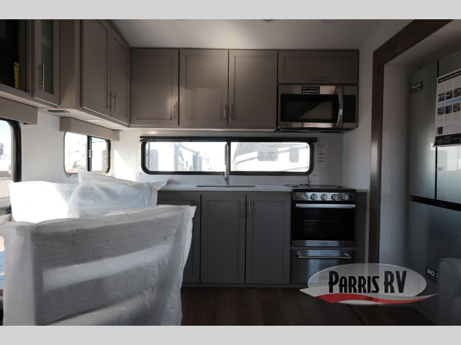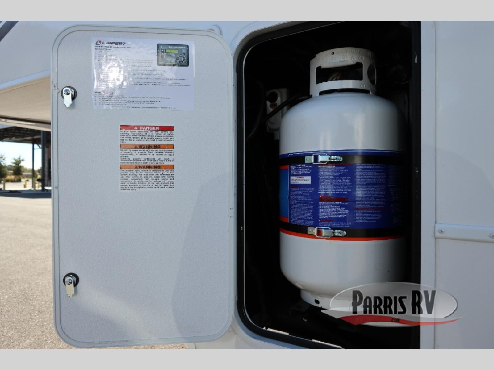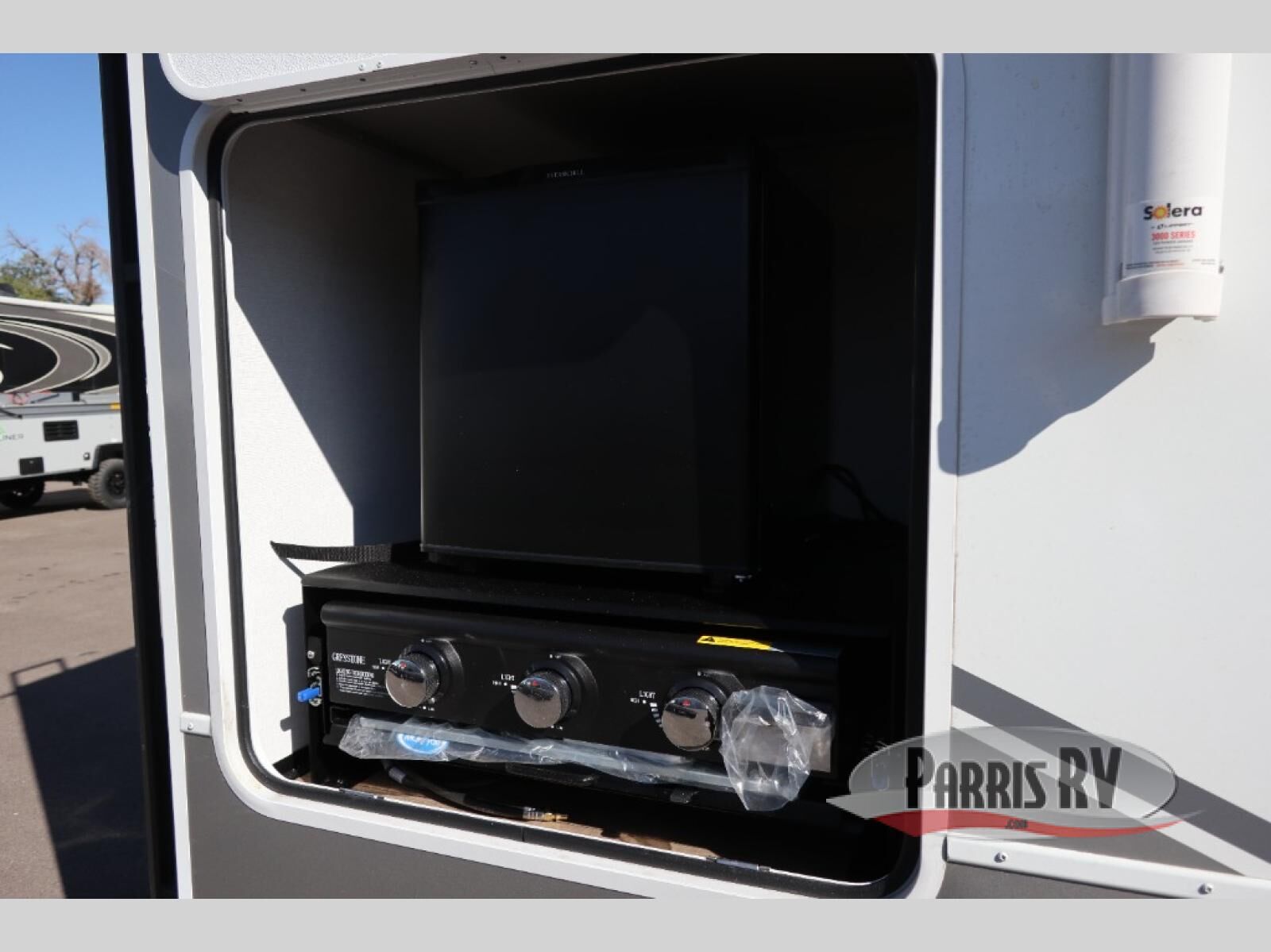 This fifth wheel is ready for adventure when you are! Once you arrive at the campground, you can put out the 16' awning, then start lunch on the exterior griddle. A booth dinette and theater sofa provide seating space inside, and there is a 50" Class HDTV to enjoy movies. The chef will also love the interior kitchen with its ample counter space, and there is plenty of storage with a hutch/pantry, second pantry, and 10 cu. ft. 12V refrigerator. Freshen up in the full bath before heading off to bed in the front private bedroom. Here, you'll find a queen bed**,** dual nightstands and overhead storage, plus a wardrobe with washer and dryer prep if you choose to add those appliances!