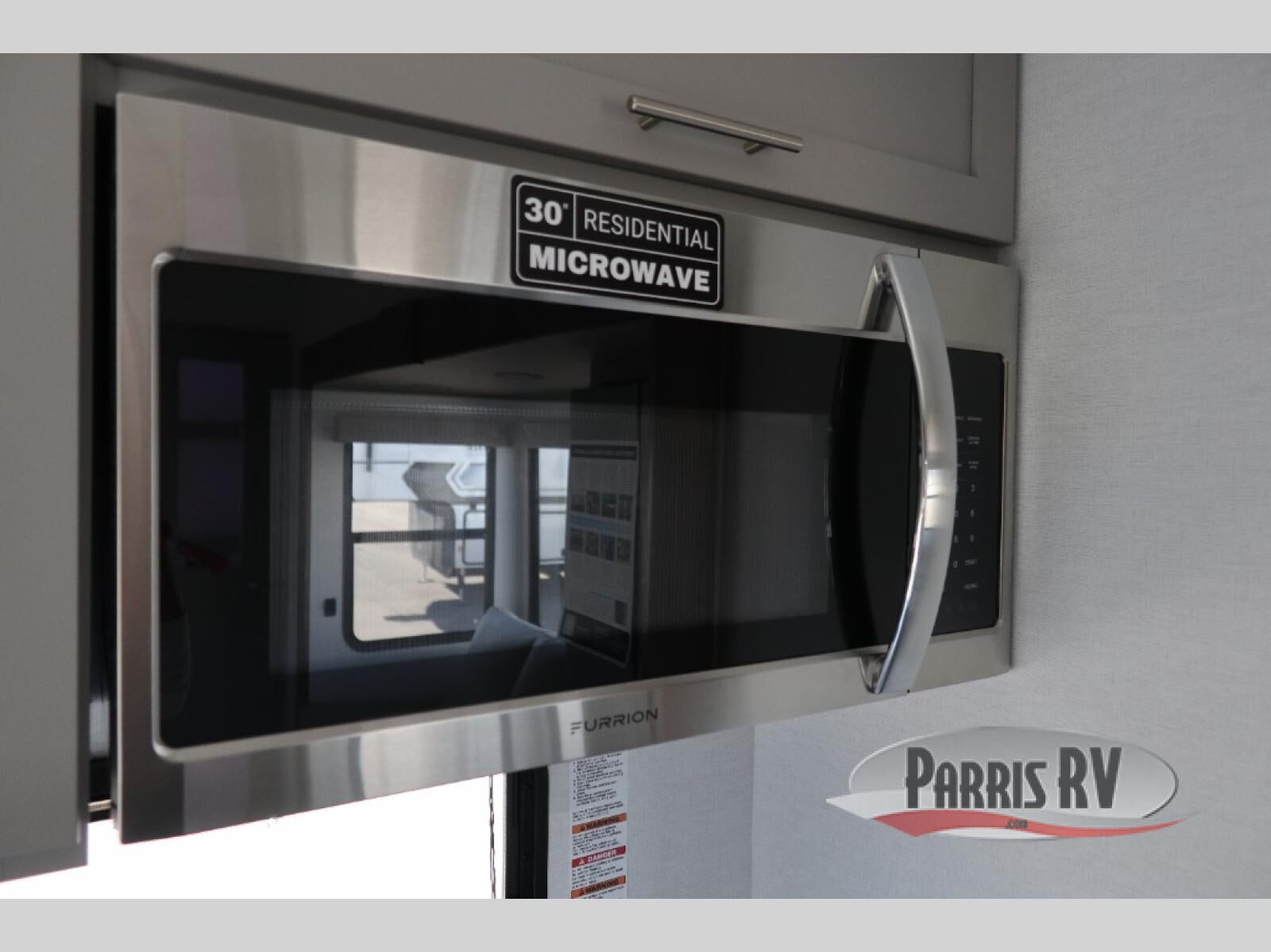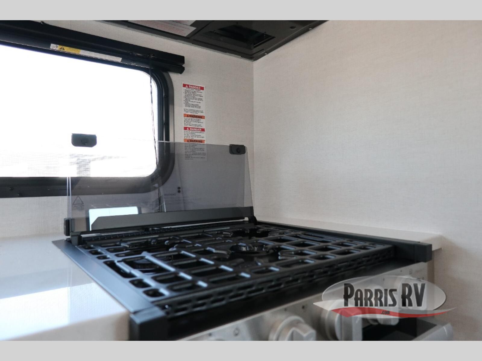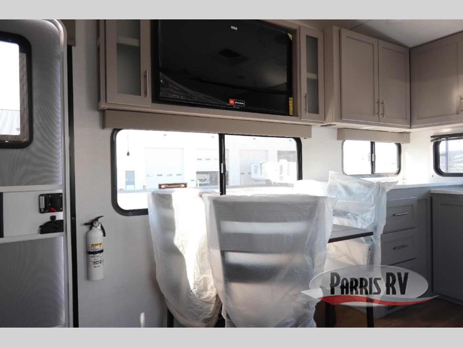 This fifth wheel is ready for adventure when you are! Once you arrive at the campground, you can put out the 16' awning, then start lunch on the exterior griddle. A booth dinette and theater sofa provide seating space inside, and there is a 50" Class HDTV to enjoy movies. The chef will also love the interior kitchen with its ample counter space, and there is plenty of storage with a hutch/pantry, second pantry, and 10 cu. ft. 12V refrigerator. Freshen up in the full bath before heading off to bed in the front private bedroom. Here, you'll find a queen bed**,** dual nightstands and overhead storage, plus a wardrobe with washer and dryer prep if you choose to add those appliances!