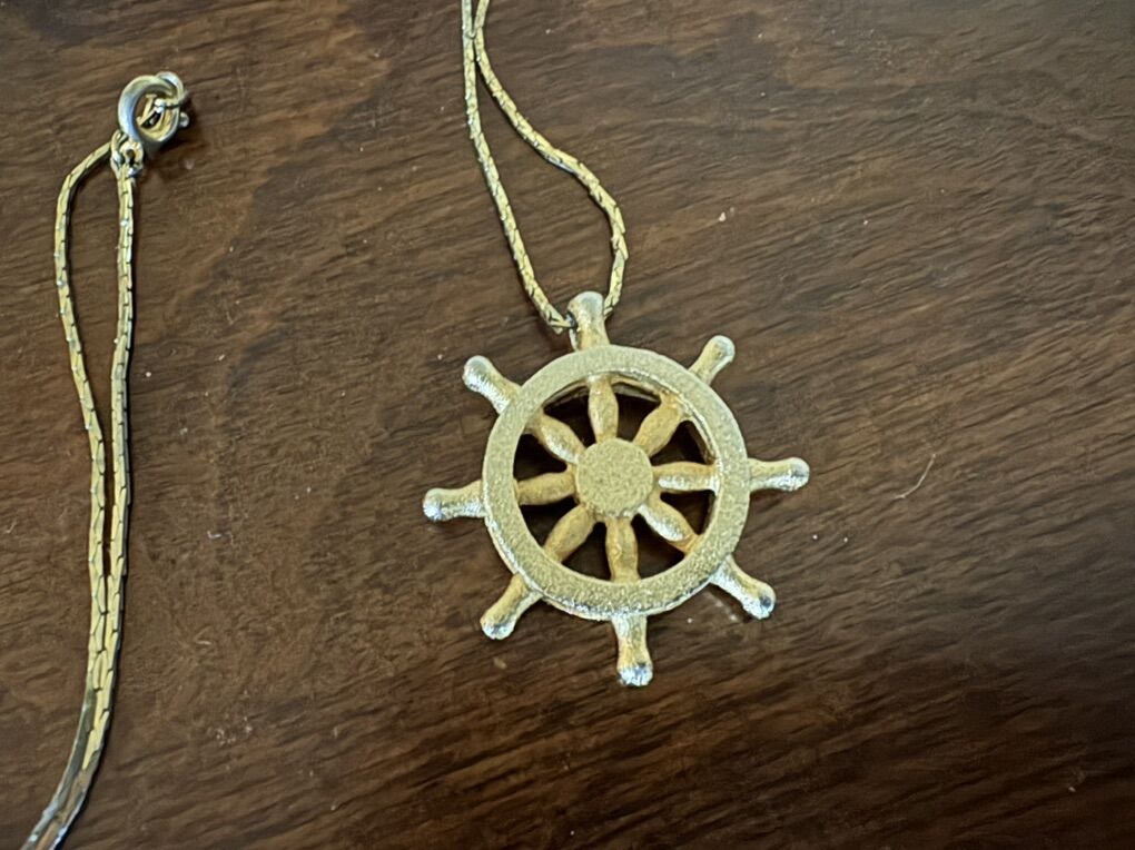 I have a nautical ship’s wheel pendant on a long necklace. The wheel is just over 1 inch across and the chain is about 30 inches long. They are both gold tone but will stick to a magnet. I don’t see any maker marks or gold content markings so I don’t know what the metal actually is. See my other ads for jewelry, artwork, home decor and more.