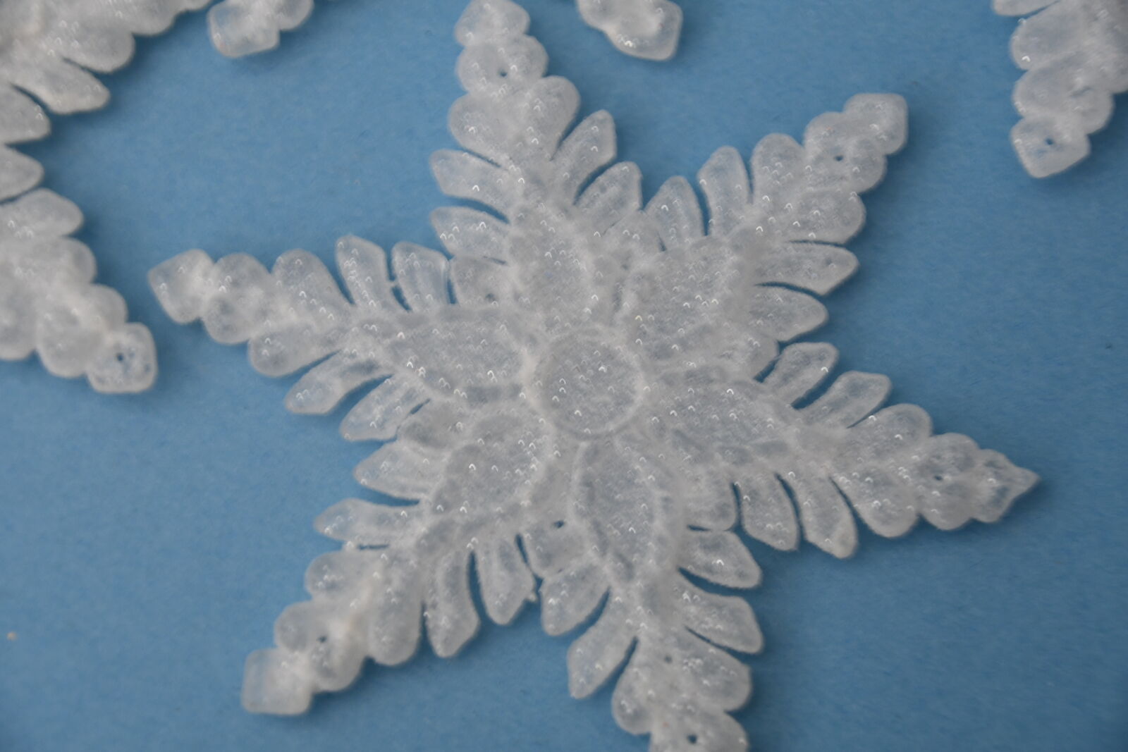 This Set of 7 GLITTERY WHITE SNOWFLAKE ORNAMENTS have a diameter of 5". Our home is smoke free. Questions??? Please ask. We are located in Plain City. Cash only please.