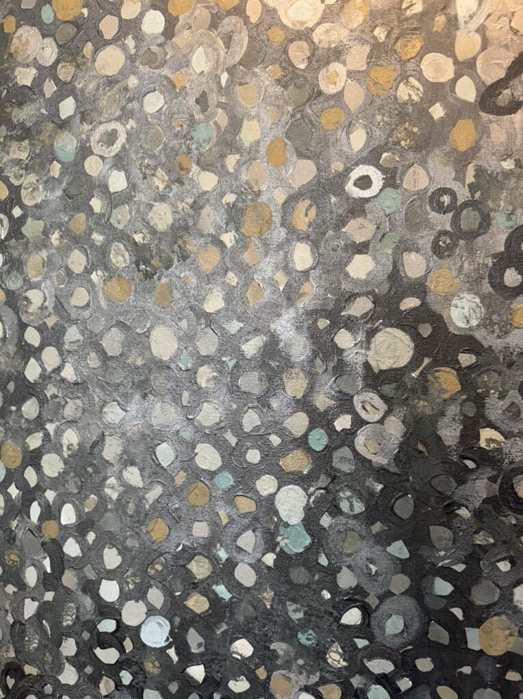 Details: • Size: 48” W × 60” H (large statement piece) • Medium: Acrylic on stretched canvas • Colors: Silver, gray, bronze, ivory, taupe, soft blue highlights