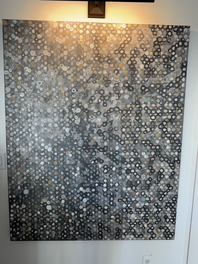 Transform your space with this stunning one-of-a-kind original painting — not a print! This oversized 48x60” canvas features layered metallics, soft gray, bronze, ivory, and slate tones that shimmer subtly under light. Perfect for modern, transitional, or luxury interiors — creates instant designer impact in an entryway, dining room, or living space.