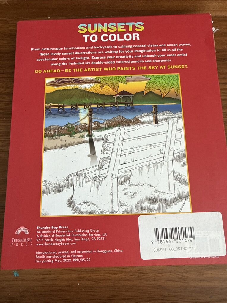The product is a coloring book titled Sunsets to Color: more than 60 Calming Images to Relax and Inspire. It includes pencils for coloring and is suitable for young adults, ages 9-12, and adults. The book contains more than 60 images of sunsets to color, providing a calming and relaxing activity for readers to enjoy. With a personalization option and a narrative type of fiction, this book is perfect for those looking to manage stress and find inspiration in their creative pursuits. The author, Josh Figueroa, offers a unique and engaging experience for readers to immerse themselves in.