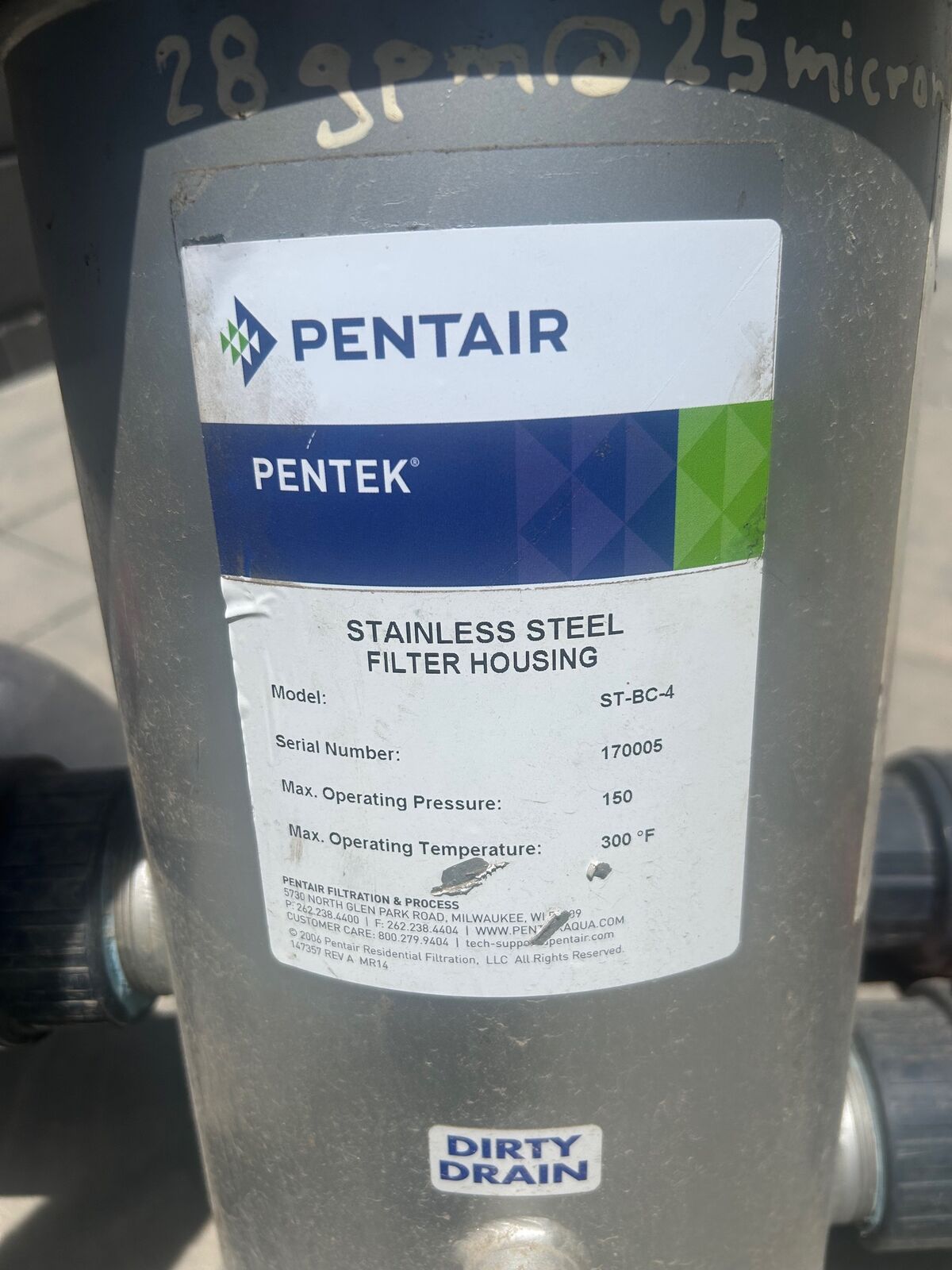VenmoPentair ST-BC-4 Stainless Steel water filter for your well or industrial, manufacturing or ??? This filter has a $2,400 list price and is plumbed with 2 PVC with a bypass to facilitate filter changes with out interupting the water flow. Tons of different filters available for it to suit your application.