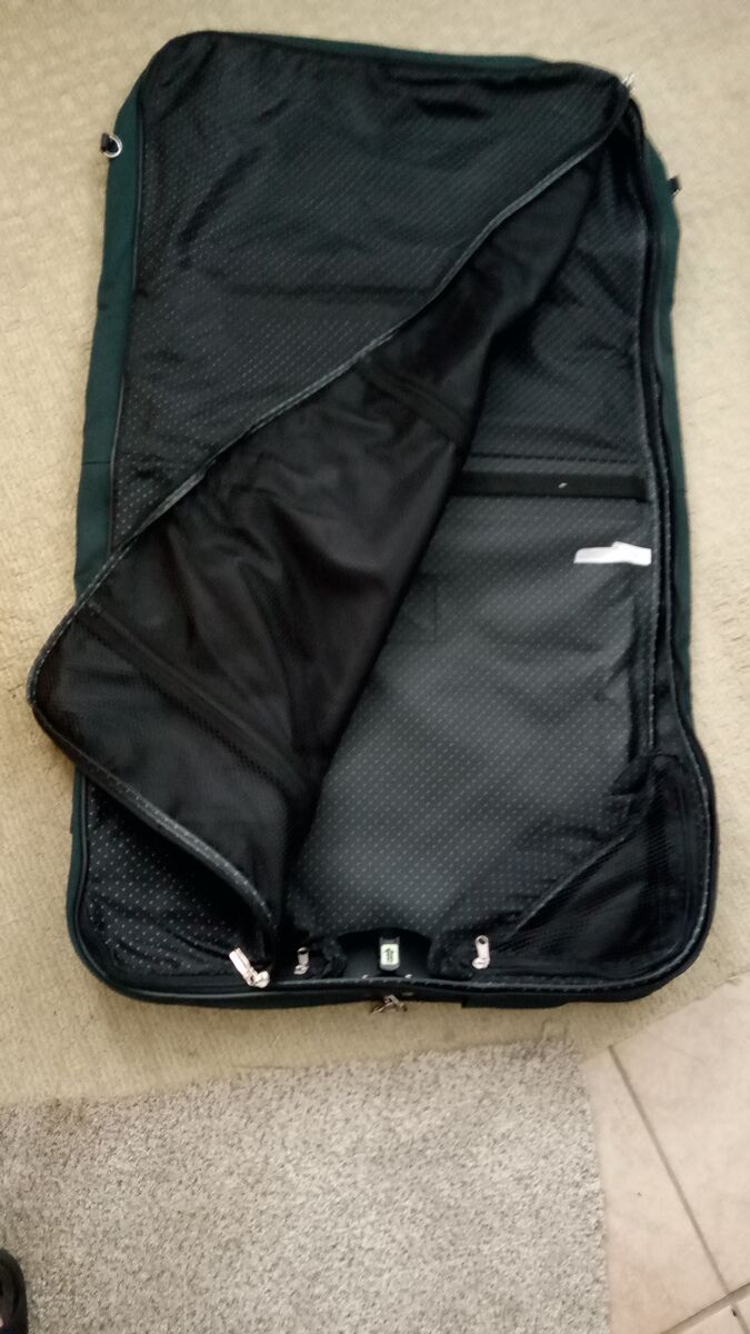 This is a literal "suitcase" made as luggage to transport actual suits or dresses, dress shirts, blouses, slacks, etc. that you want to avoid wrinkling during transport. It hangs flat and the clothing items inside are attached like they would hang in your closet, it then has a single high radius fold in the middle at the handle. New about 20 years ago, barely used (maybe once or twice). Comes with zipper locks and key.