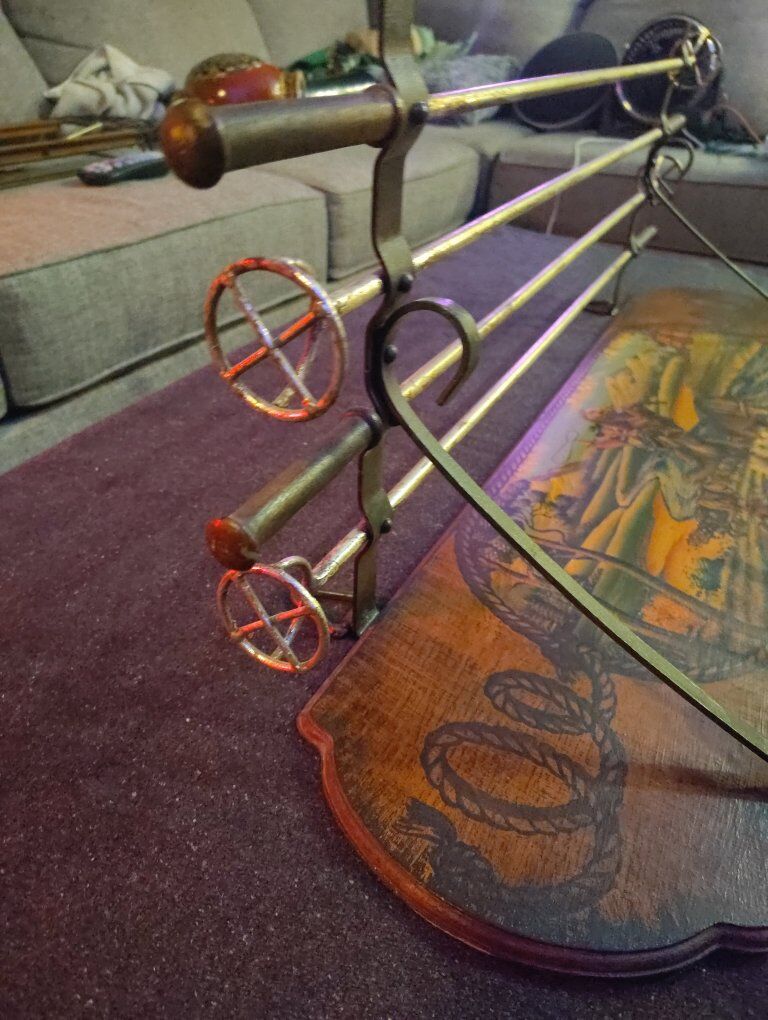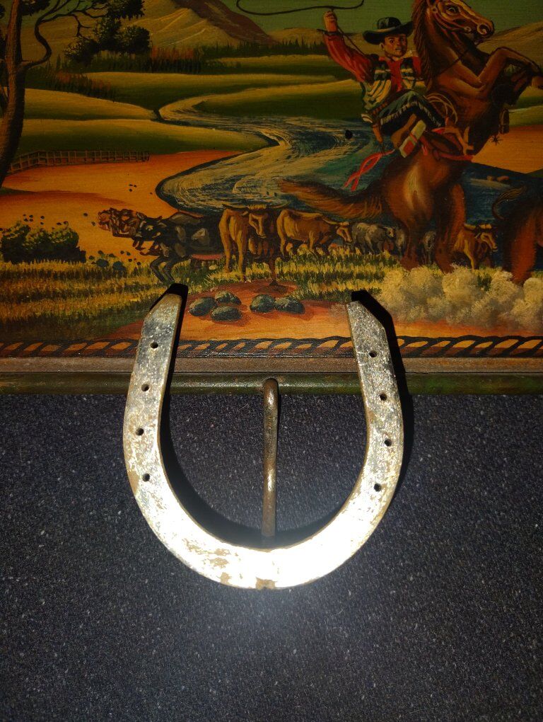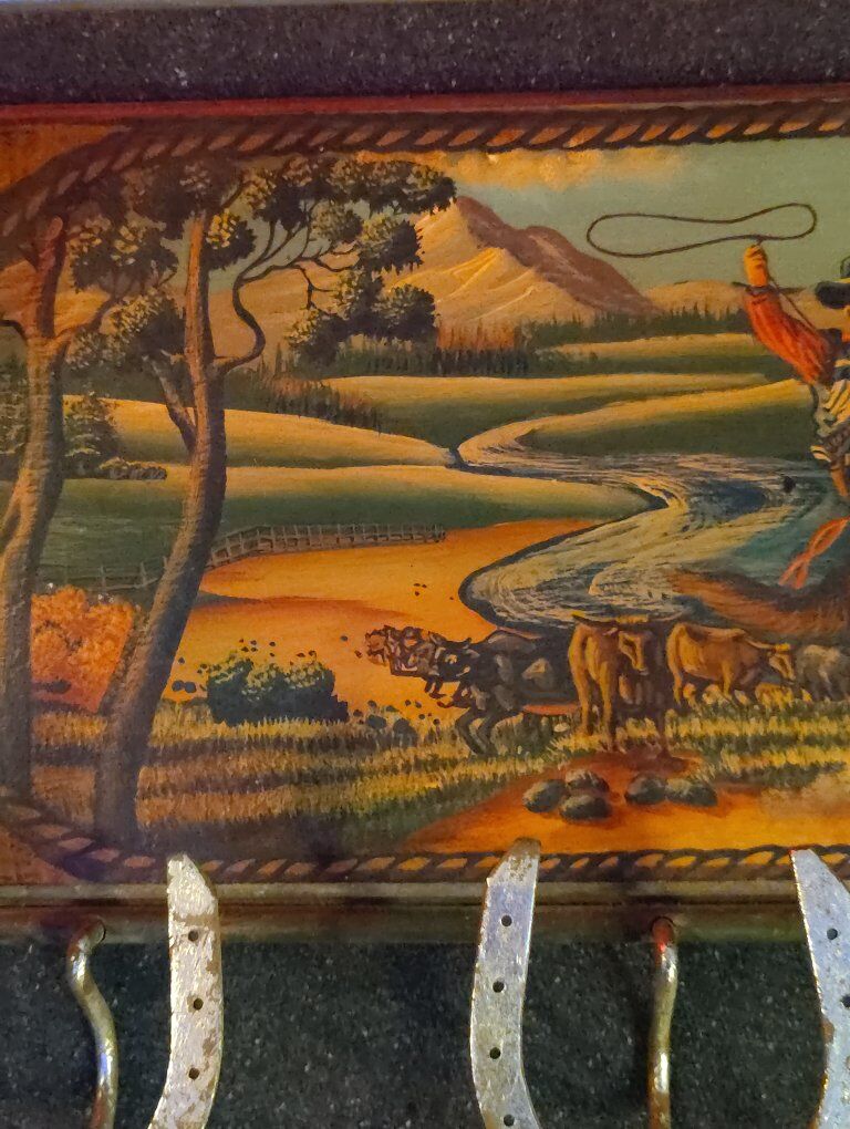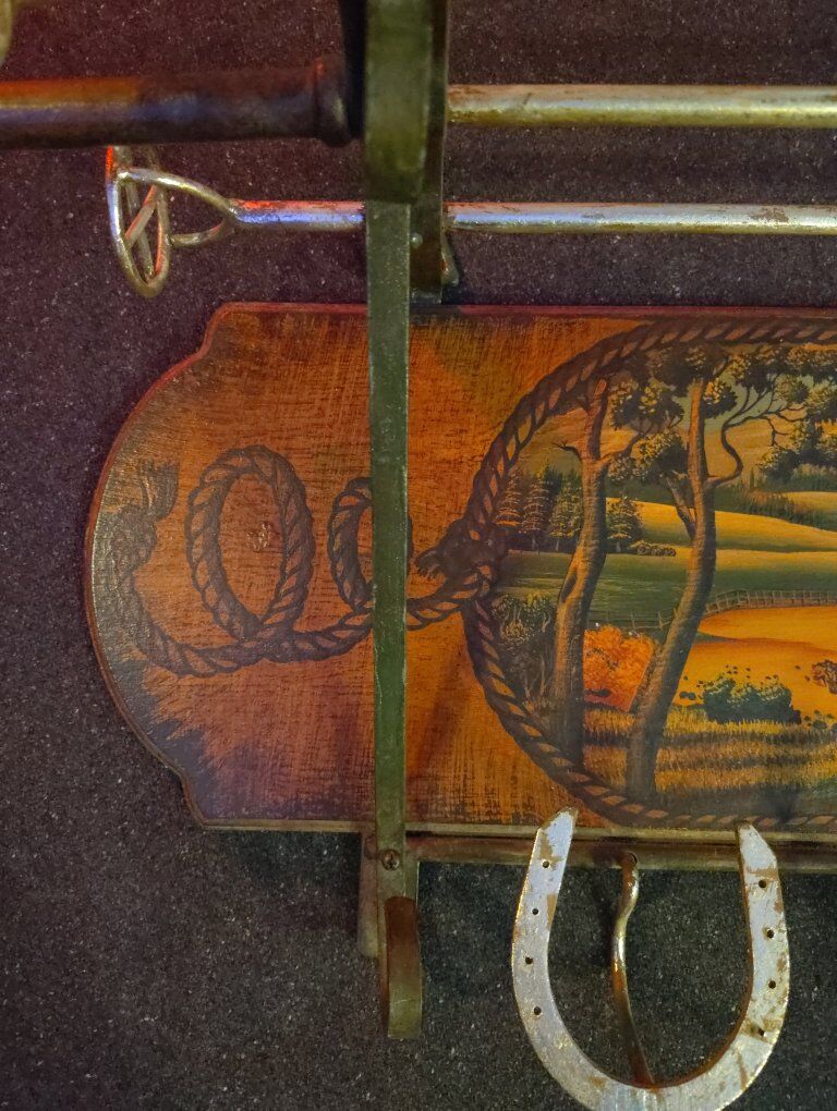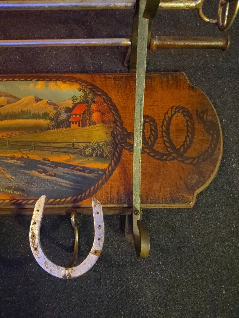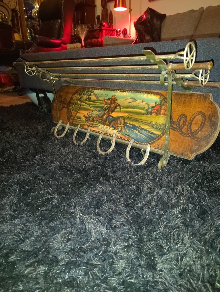 CashAppReally cool and very well made is this late 40s early 50s vintage Roy Rogers/Trigger Shoe and Coat rack with 4 horseshoes on the bottom to hang your coats and 4 branding irons on top to store your shoes and is a really unique rack and is approximately 37"wide x 12"deep x 13"tall and would be perfect for horse lovers-man caves or a neat piece to just hang up and make a great conversation piece