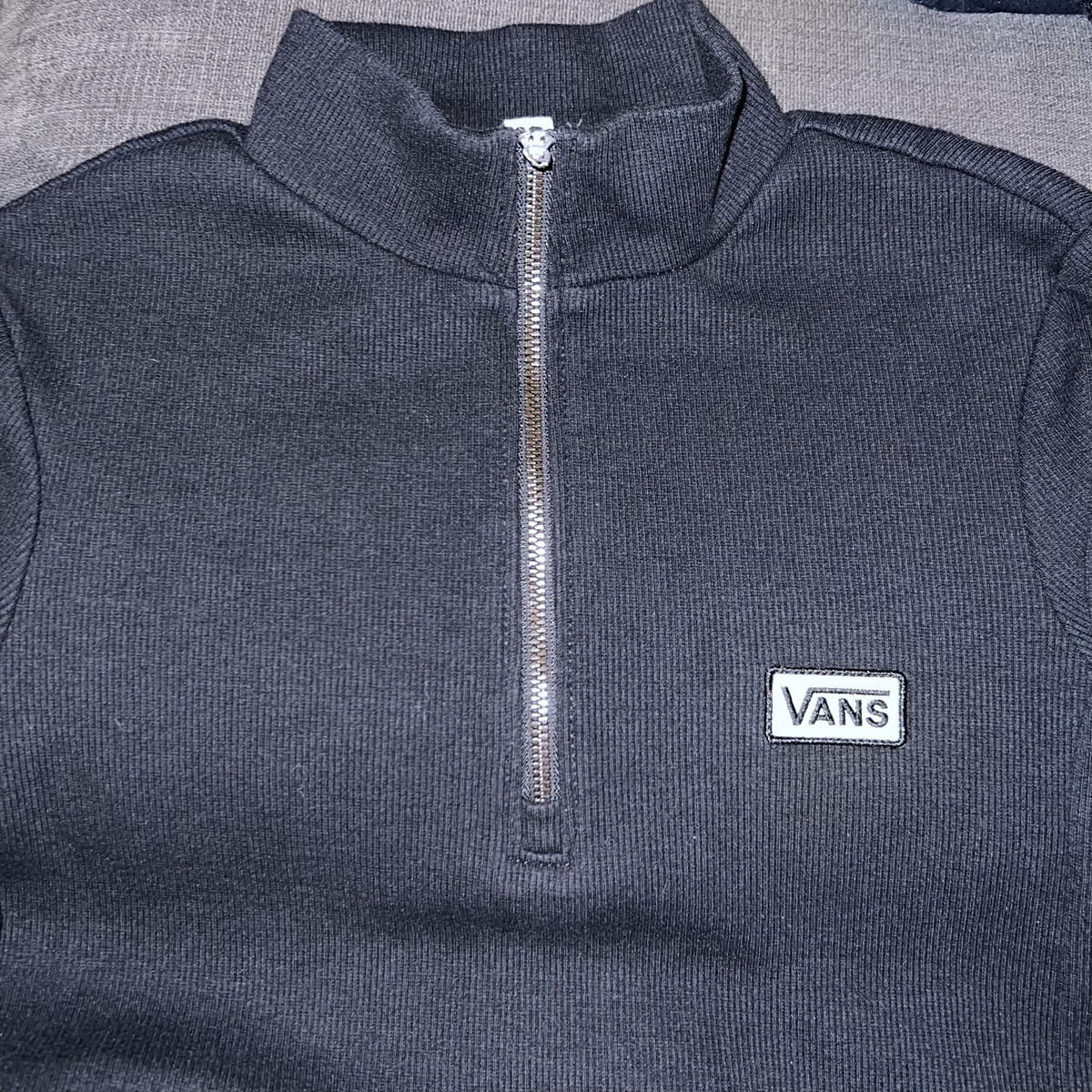 VenmoGreat preowned condition. It's long sleeve and features a quarter zip mock neck collar, it's ribbed, and has the Vans logo on the left chest. The only thing to mention is that the tip of the zipper is broken off. The top part of the zipper is still attached, making it still functional.