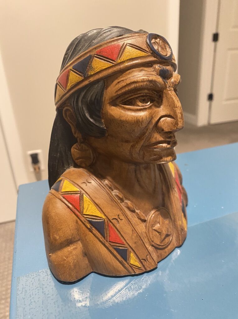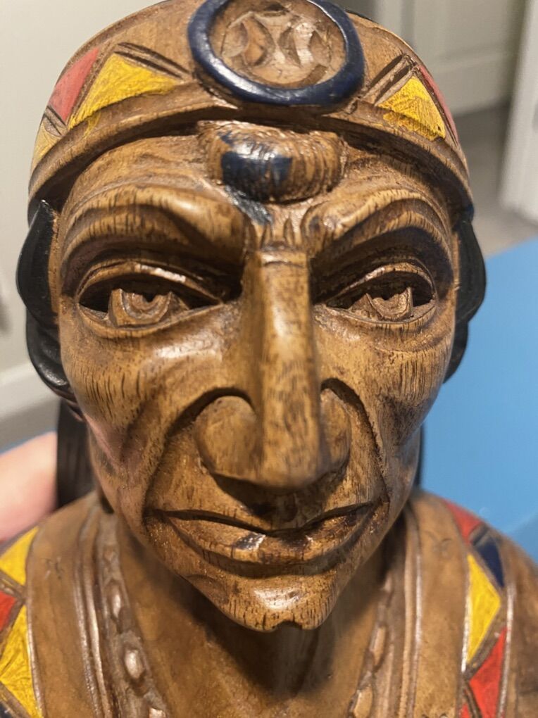 VenmoThis wooden bust depicts Atahualpa, the last sovereign emperor of the Inca Empire before the Spanish conquest in the 16th century. The carving features traditional geometric patterns in red, yellow, and blue that are characteristic of Andean artistic traditions, along with symbolic elements like the star medallion that represents Inca nobility.