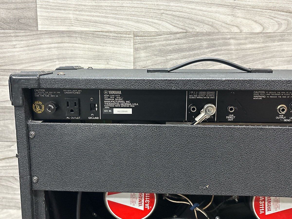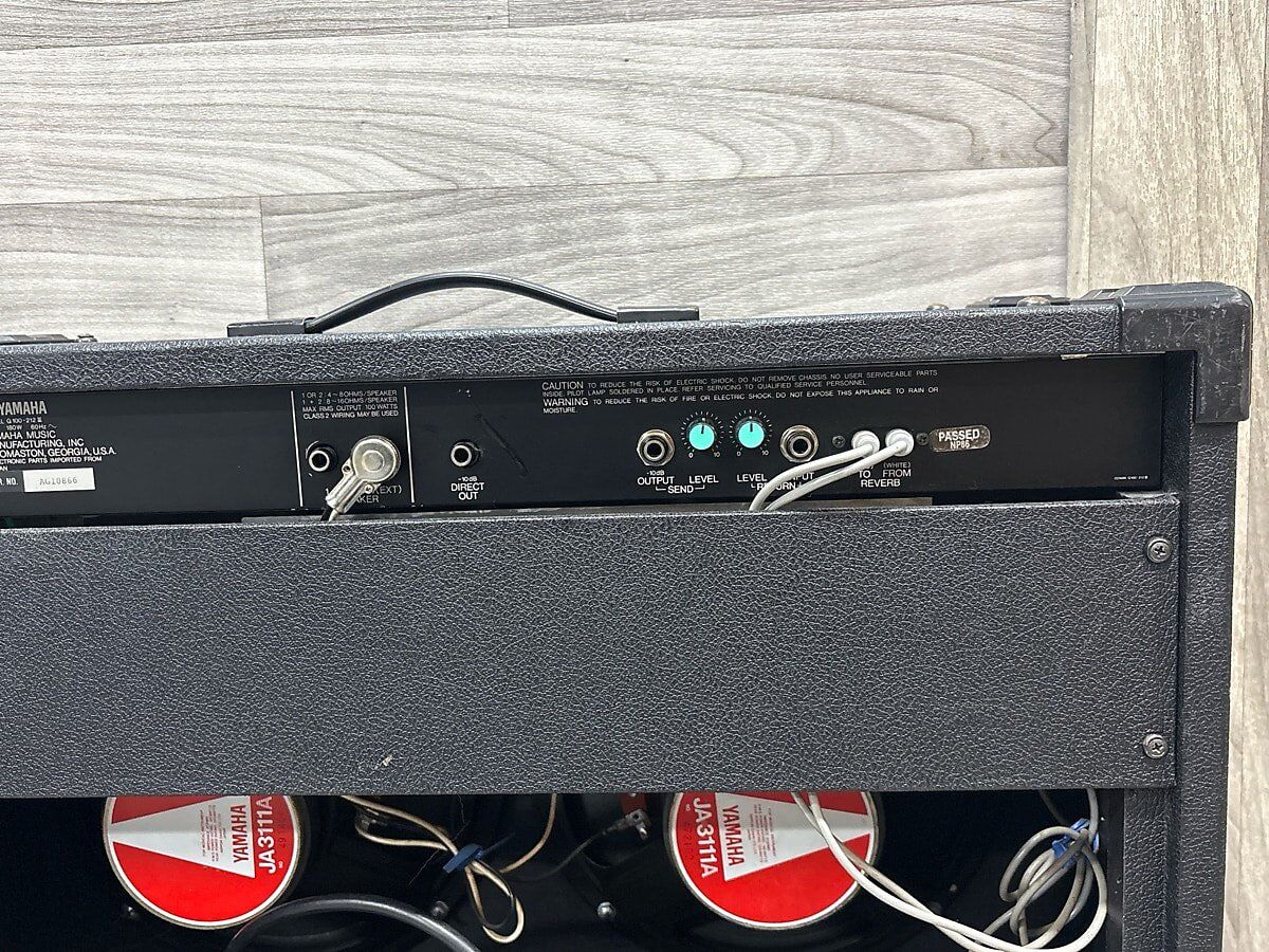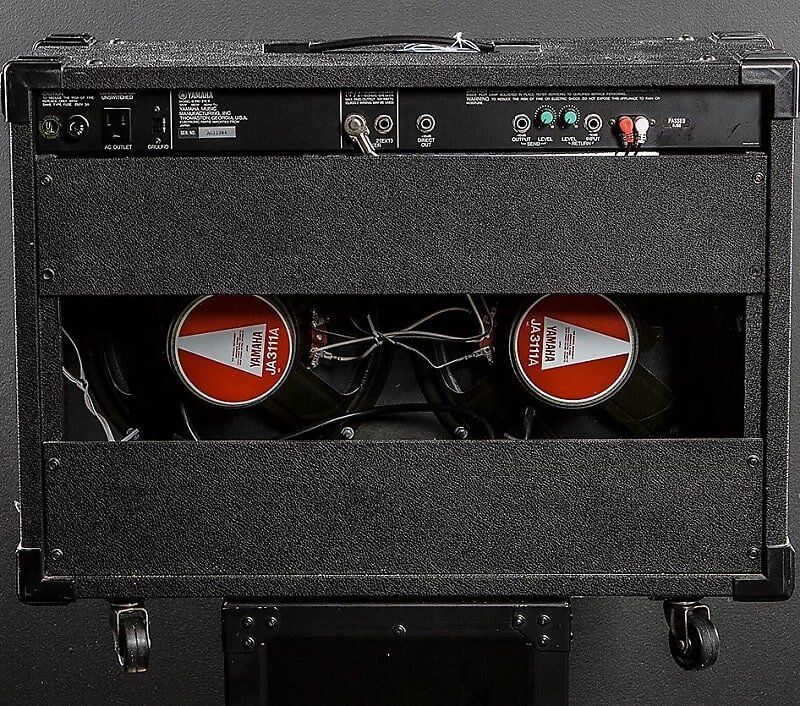 “If you’re familiar with these amps they are the 1980s Yamaha version of the Fender Twin Reverb. They were designed by Paul Rivera and made in six speaker variations: 2-10s, 4-10s, 1-12, THIS ONE!!! 2-12s, 1-15 and a 4-12. They’re 100% solid state and these amps produce a plethora of different sounds and are treasured by Jazz players. This amp has 2 Yamaha made 12” speakers, model JA311A.”