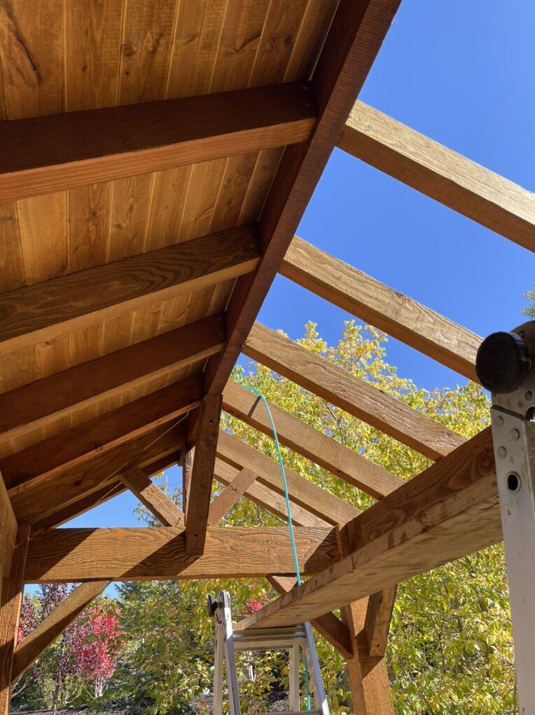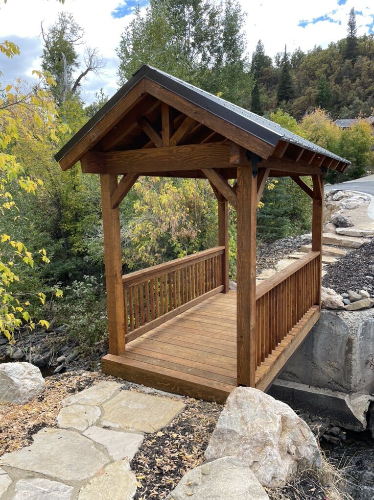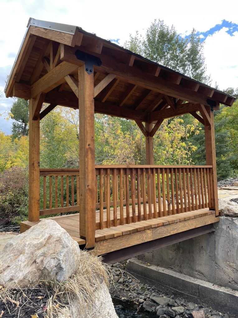 7x14 timber pavilion. Perfect size for a seating area or picnic table. Same size and style as the one pictured (just not a bridge). Optional deck and railing are available. Built onsite, able to customize stain and roof color. $4500 OBO
