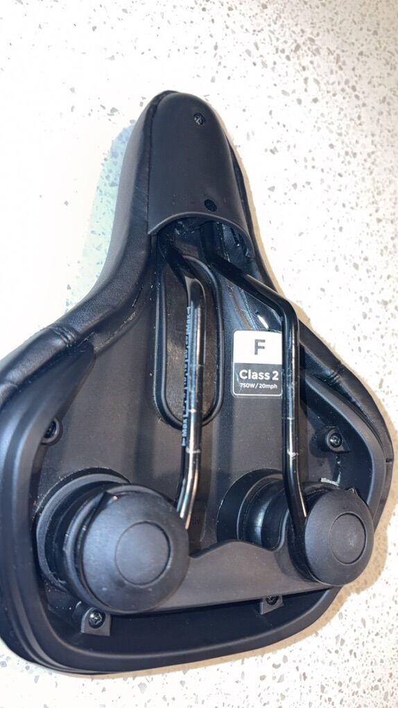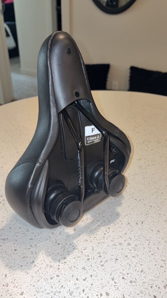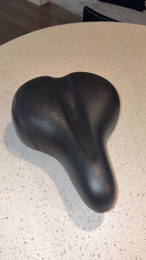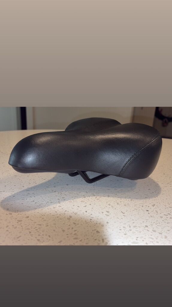 •Brand new/nothing wrong with it, I just bought a new seat and don’t need this one anymore. •Type: Comfort cruiser or commuter saddle (not a narrow racing seat) •Dual-density foam or gel padding, wide ergonomic shape with a center relief channel (for comfort and reduced pressure) •Rails: Standard twin-rail steel mounting (fits most seatposts that use a clamp) •Cover Material: Black leather/water resistant finish •Comes with the brand new suspension seat post parts/pieces as well
