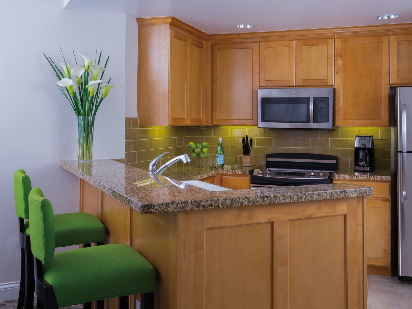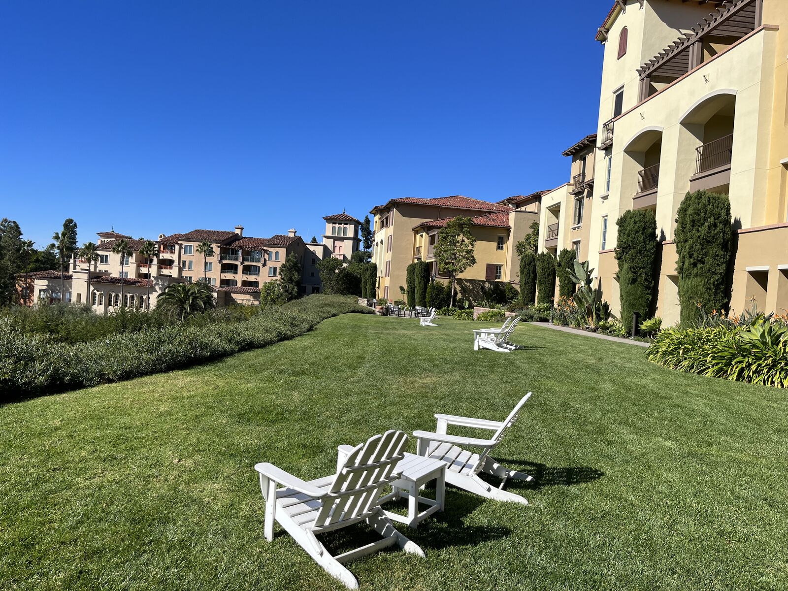 Elegant two bedroom, two bath units, with full kitchen, living room and dining room and a private balcony, with table and chairs, and view of Pacific Ocean. Washer and dryer, free parking and free internet.