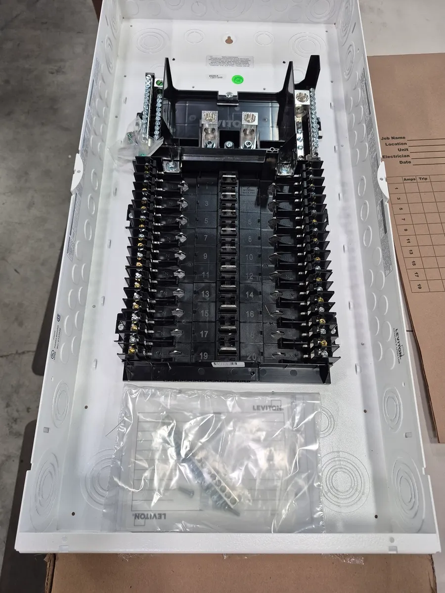Venmo125A Amp 20-Space Indoor Load Center with Main Lugs Leviton Indoor Load Centers are easy to install and feature a white enclosure for a modern, appealing unit. All hot and neutral wires terminate at custom lugs in the panel, not at the circuit breaker, so the entire panel can be wired at rough-in without circuit breakers installed. Leaving the option of having the circuit breakers easily plugged-on at final installation. An optional observation window in the cover allows at-a-glance operating status of all the circuit breakers (sold separately). SLC-103317